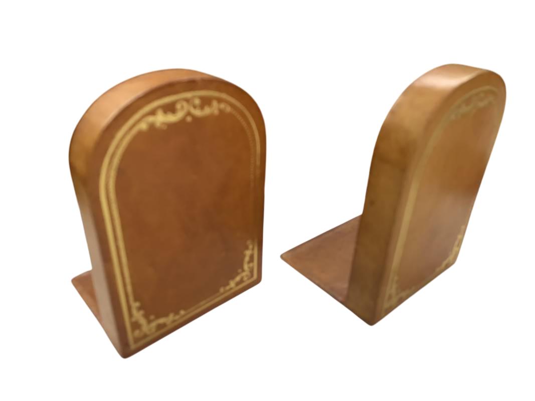 Coppia di fermalibri reggilibri antichi metallo dorato e legno primi del 900