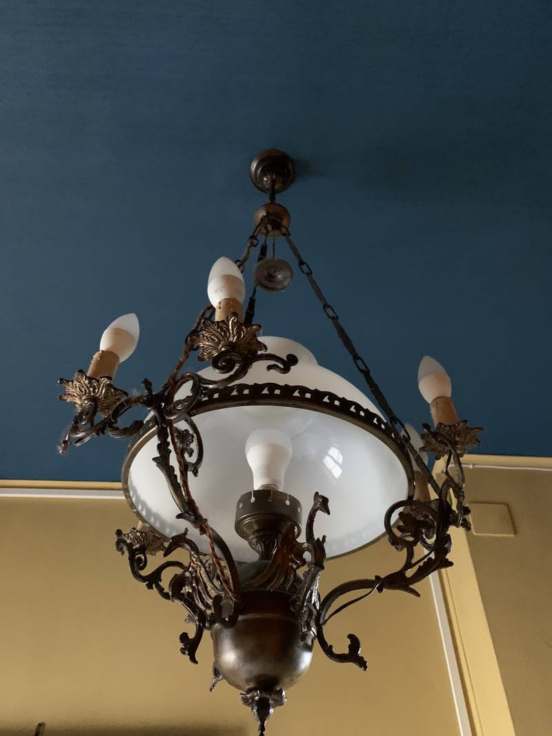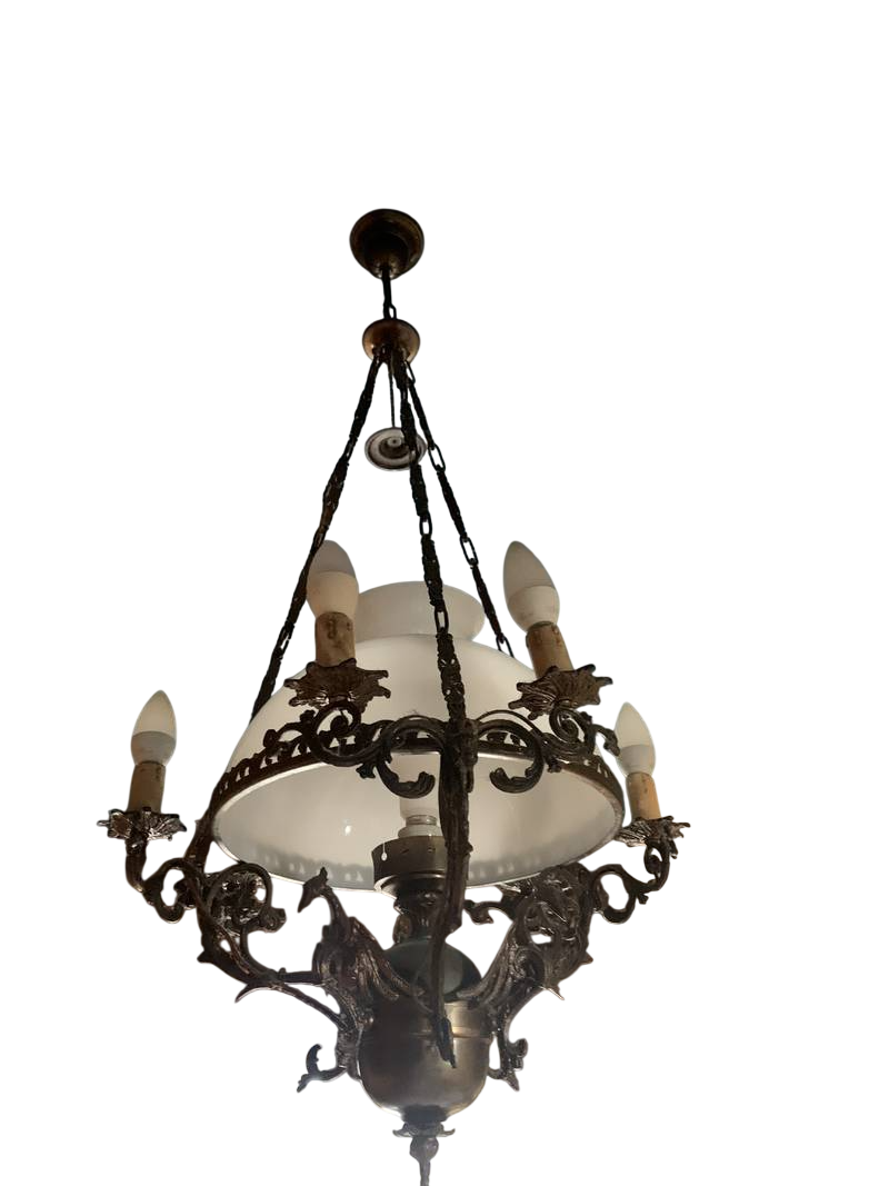 Antico lampadario con 3 tulipes in vetro smerigliato bronzo dorato Art Nouveau