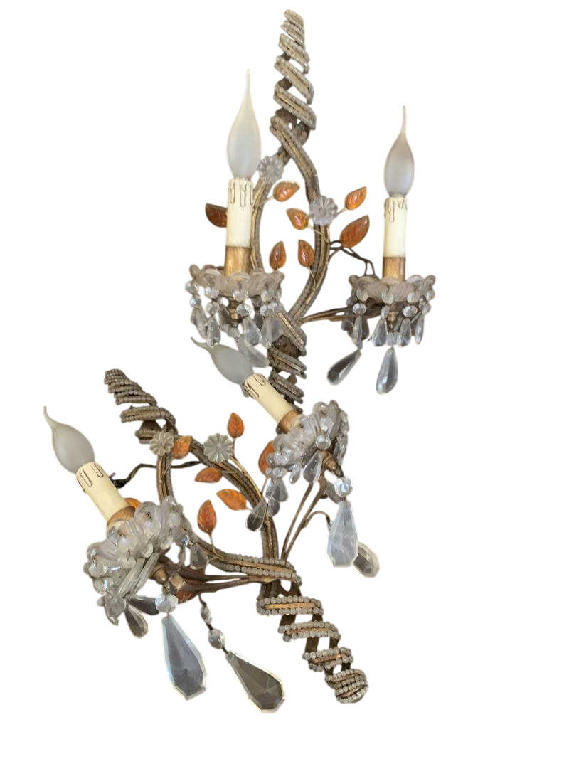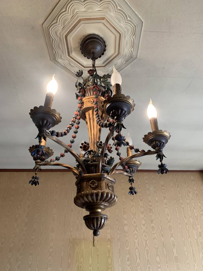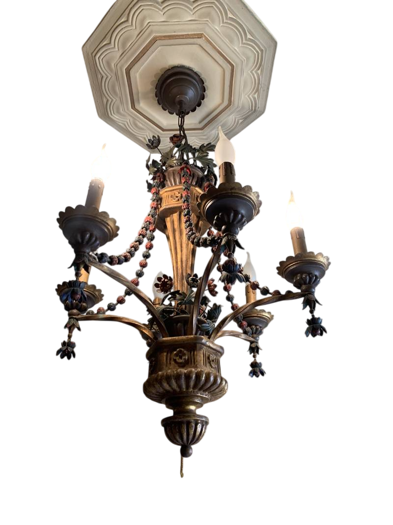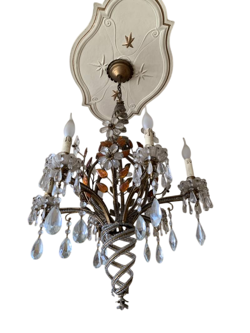 Antico grande lampadario 8 luci pendenti in cristallo e fiori epoca XIX secolo