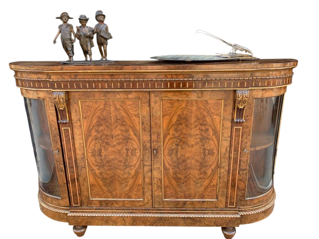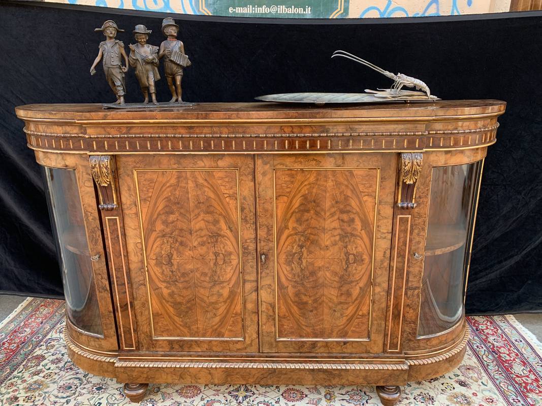 Antico mobile credenza servante inglese in radica con vetrina laterale Londra