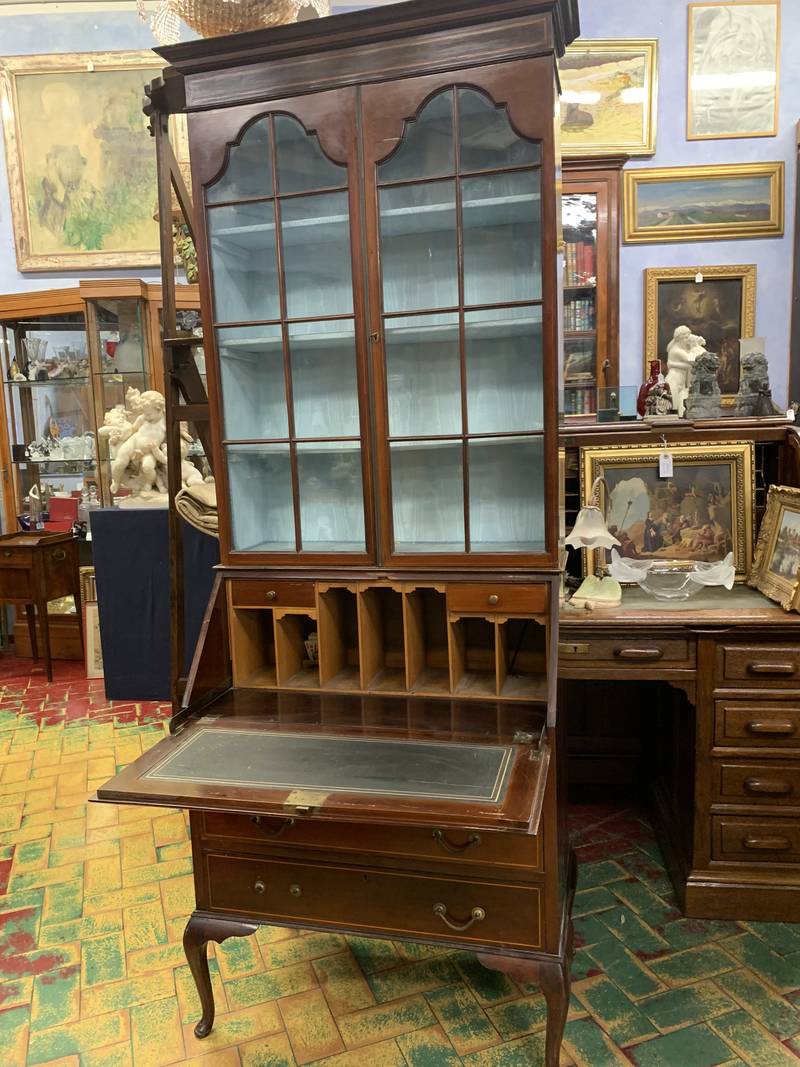 Libreria inglese bookcase in mogano con ribalta a scrittoio con dipinto Londra –