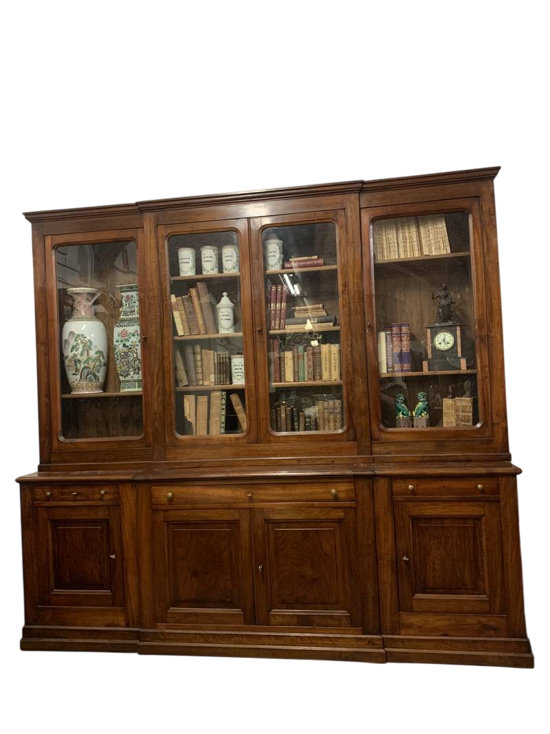 Antica libreria Direttorio a doppio corpo in noce epoca XIX secolo vetri soffiati