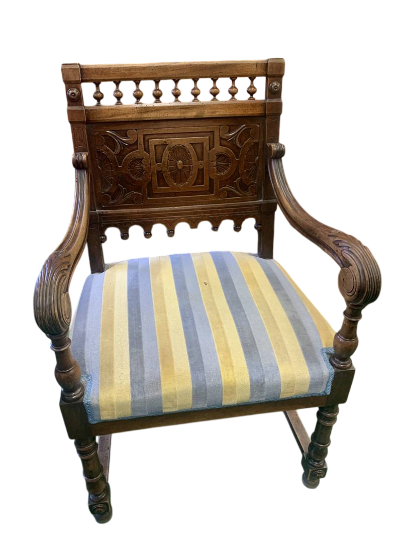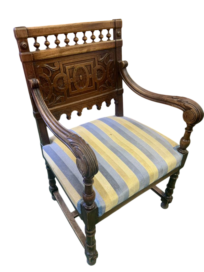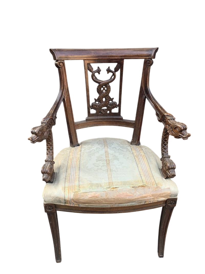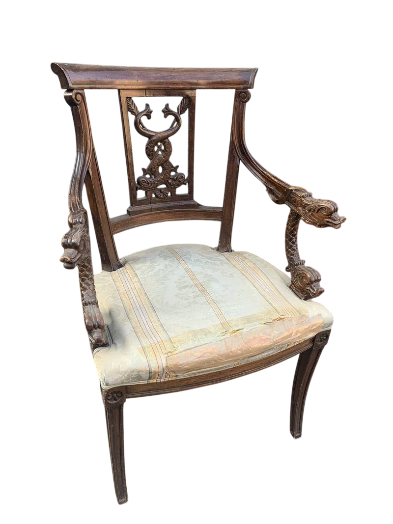 Antica poltrona della fine dell’800 intagliata braccioli con delfini mitologici