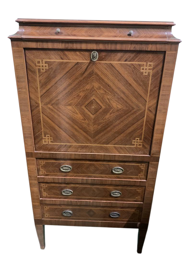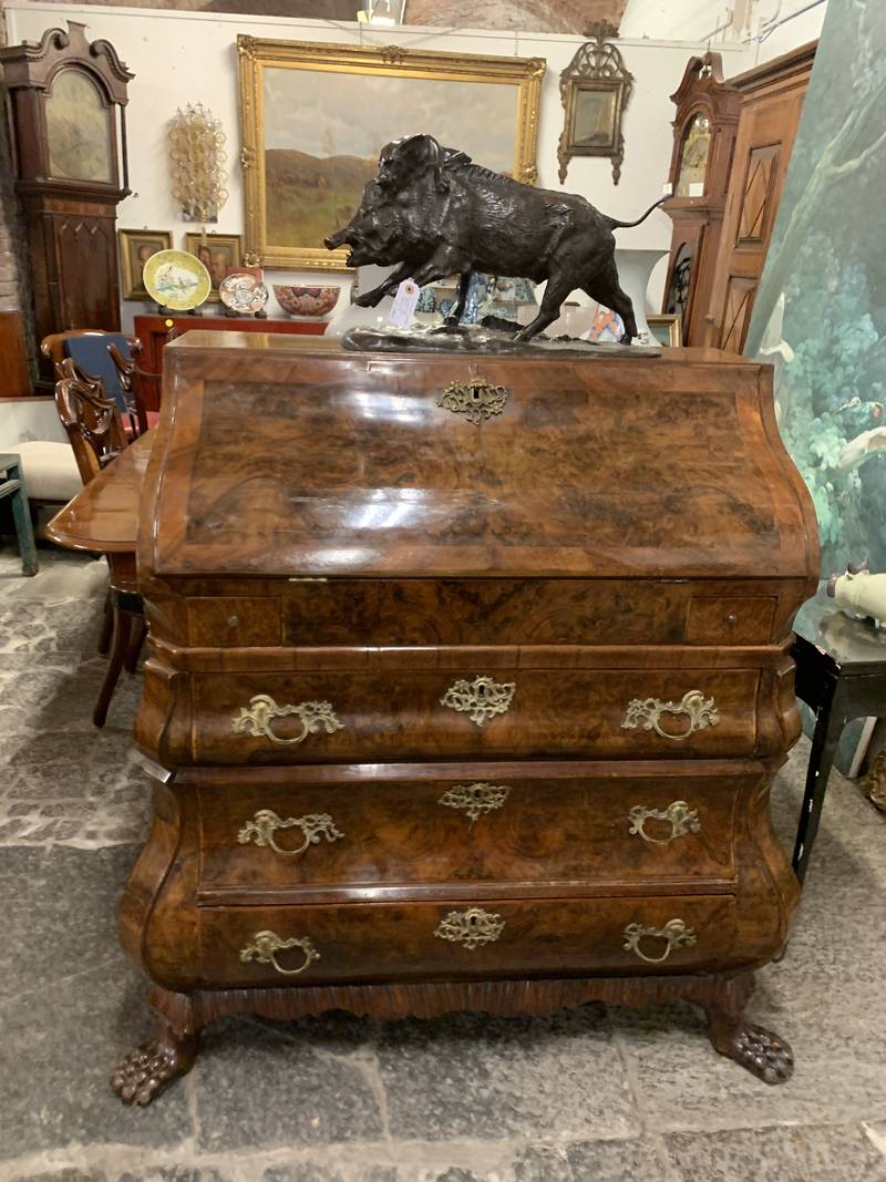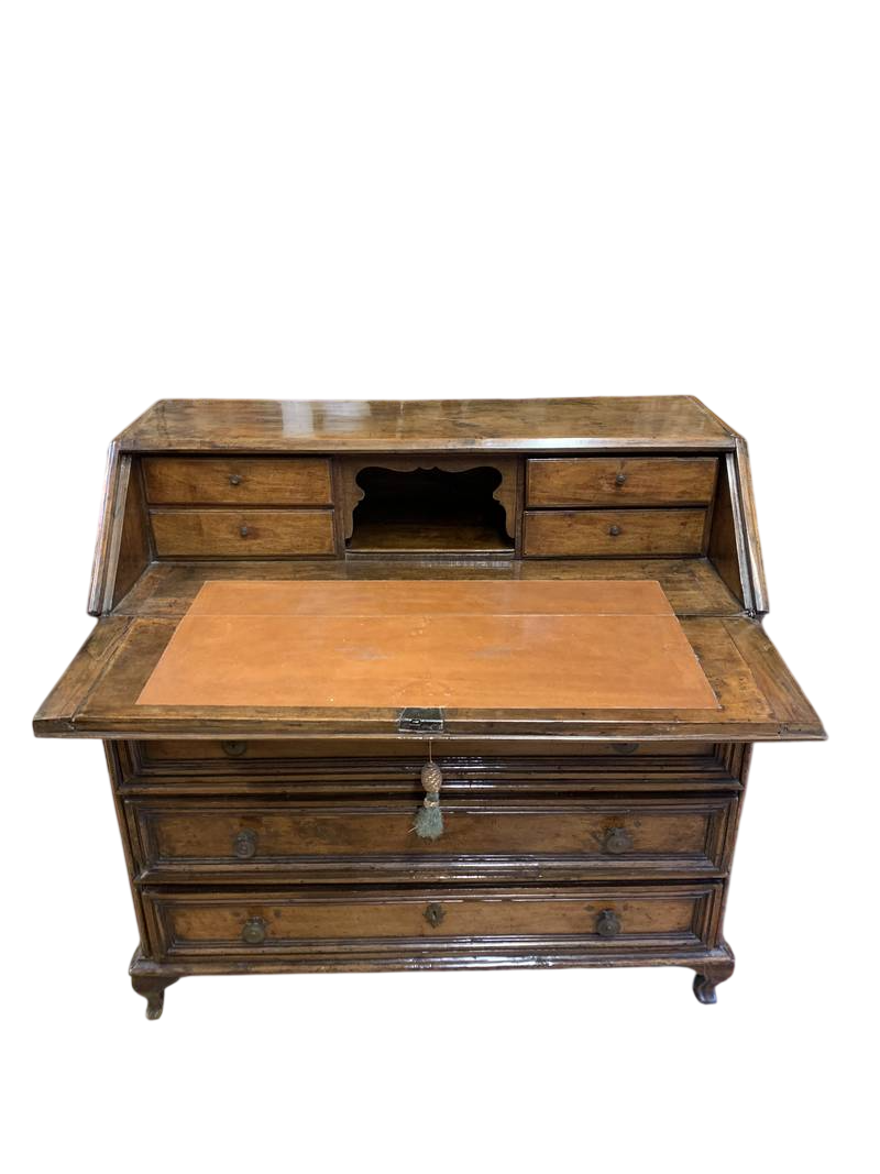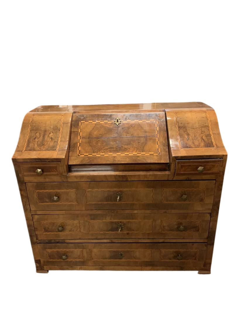 Antico cassettone con ribalta intarsiata Veneta epoca 700 noce e radica di noce