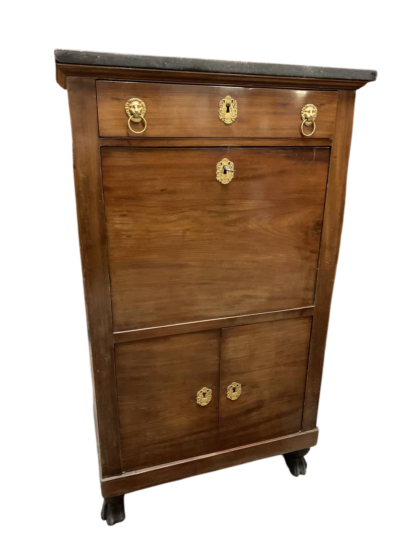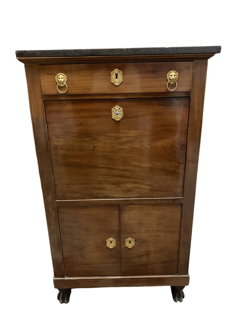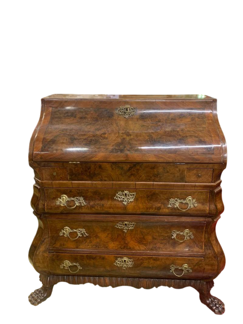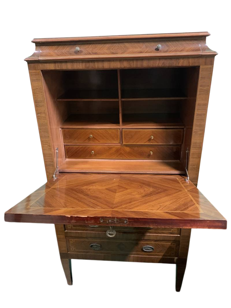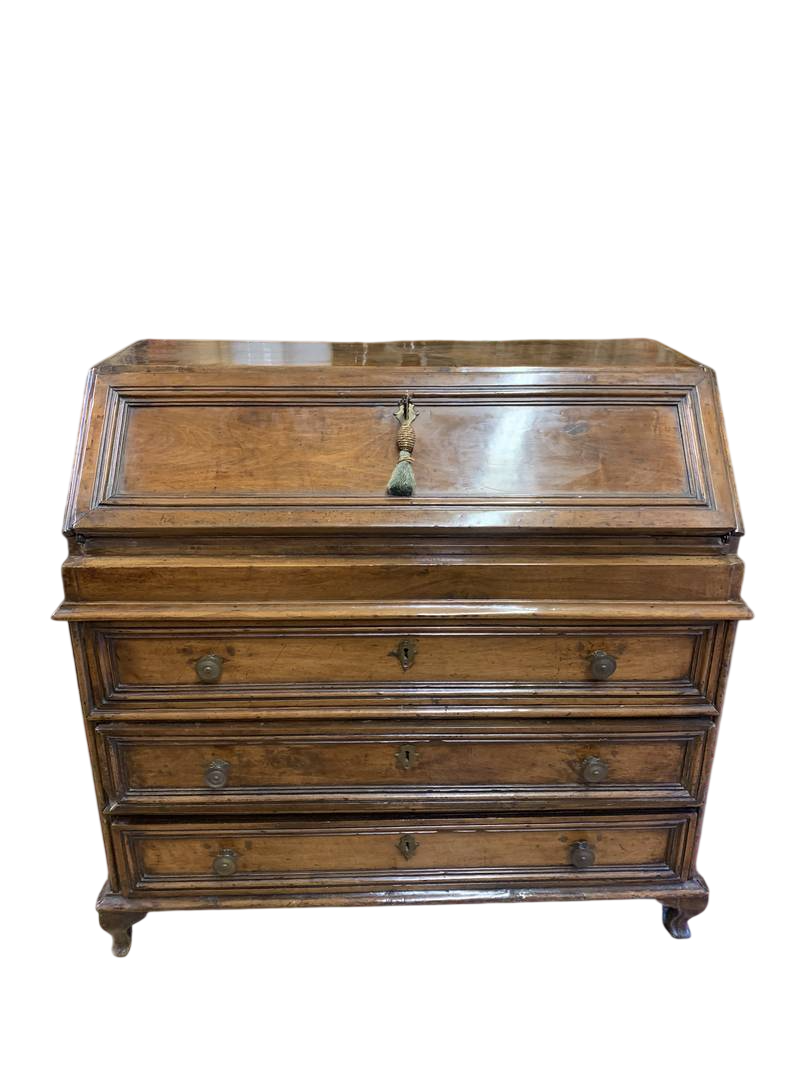 Antico cassettone con ribalta intarsiata Veneta epoca 700 noce e radica di noce