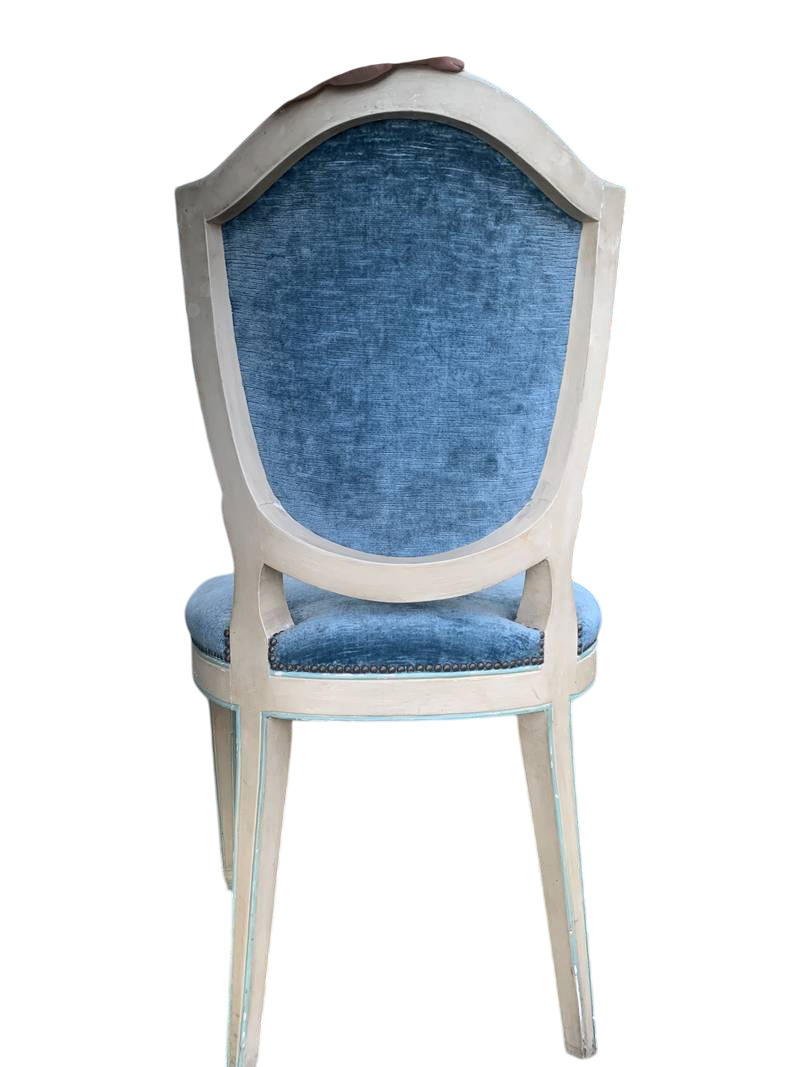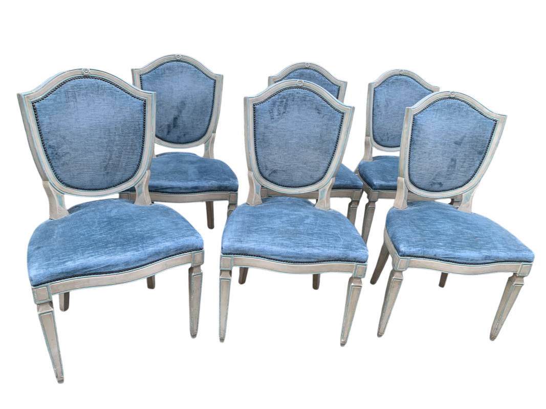 Gruppo di 6 sedie poltroncine Luigi XVI del XX sec laccate velluto azzurro