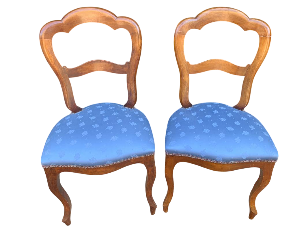 Coppia di antiche poltrone in stile Luigi XV in noce imbottite azzurro XX secolo