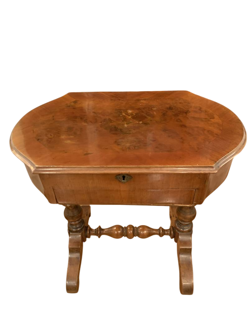 Antico tavolino porta lavoro porta cucito in noce del XX secolo