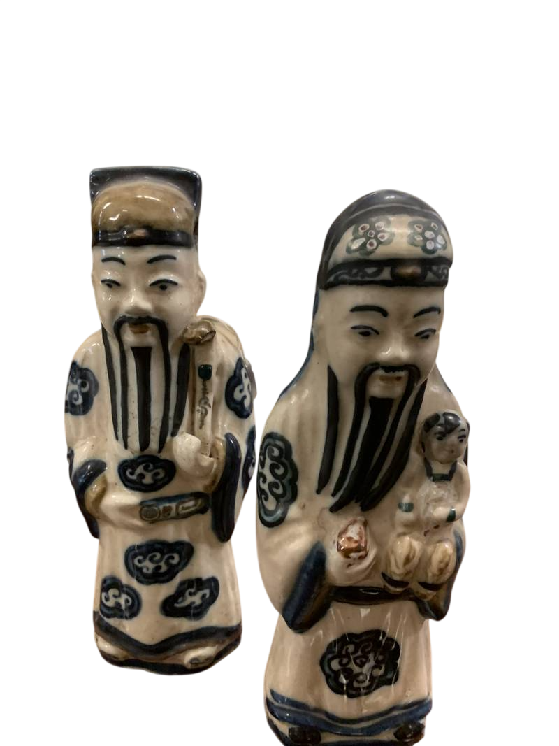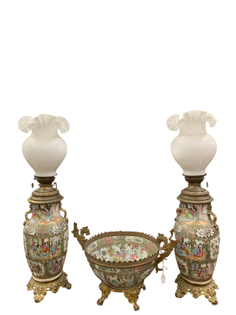 Trittico di antiche porcellana cinese Canton centrotavola e lampade ad olio