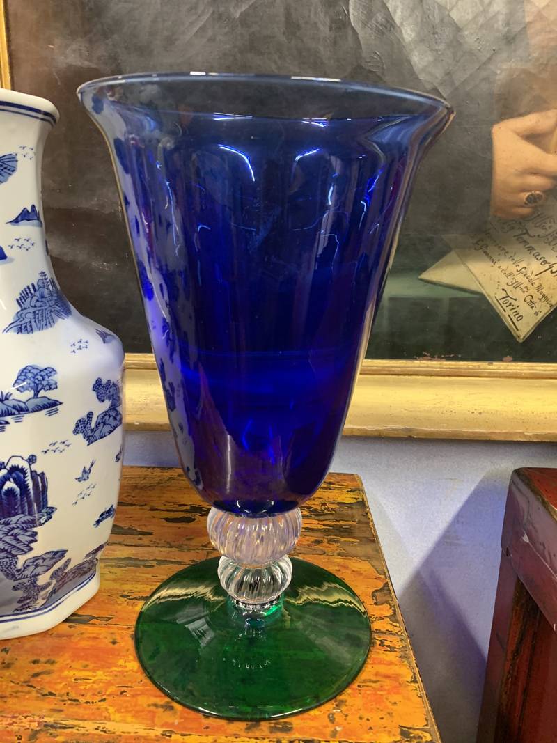Grande vaso a calice in vetro d’arte Murano blu cobalto con base verde