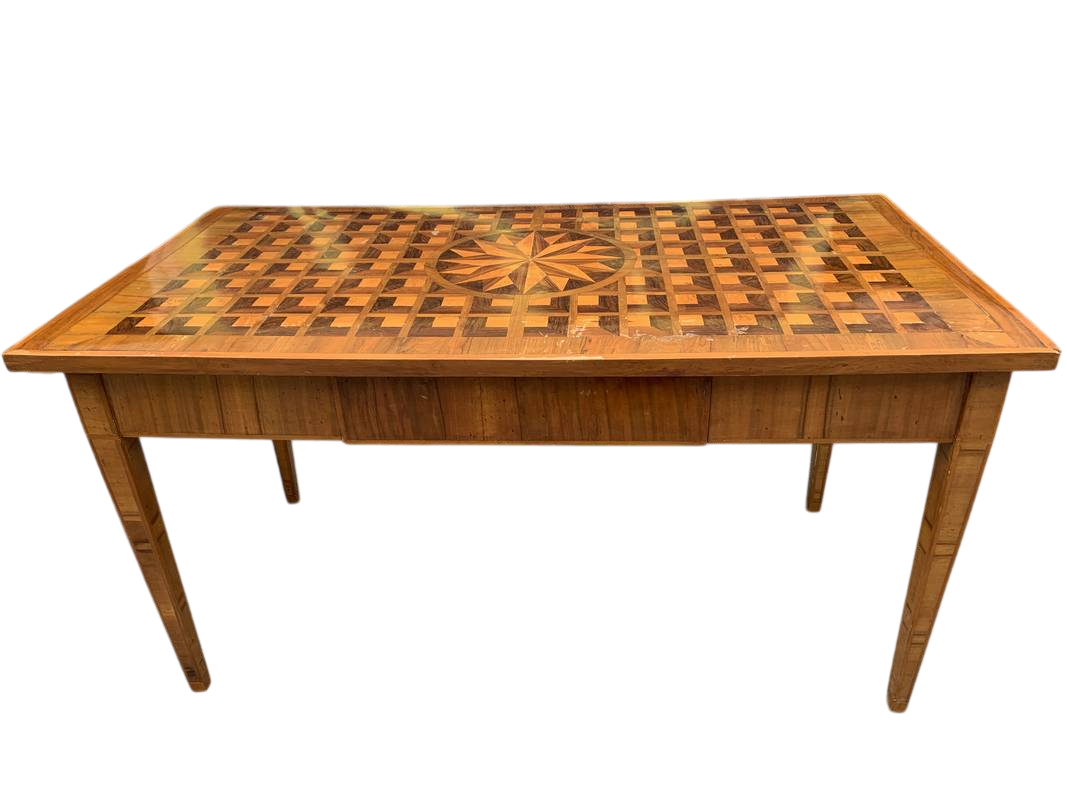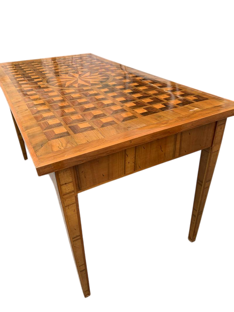 da centro di forma rettangolare impiallacciato in noce, palissandro e altre essenze pregiate, riccamente intarsiato sul piano a motivi geometrici e rosone centrale. Gambe troncopiramidali