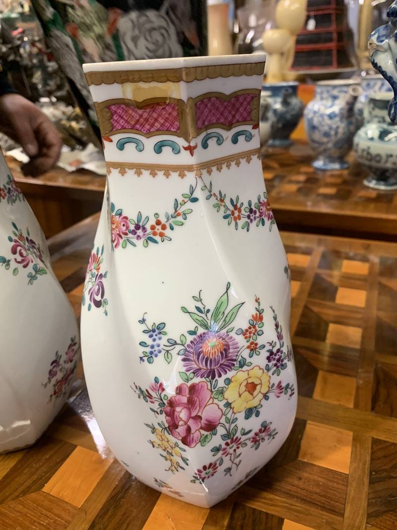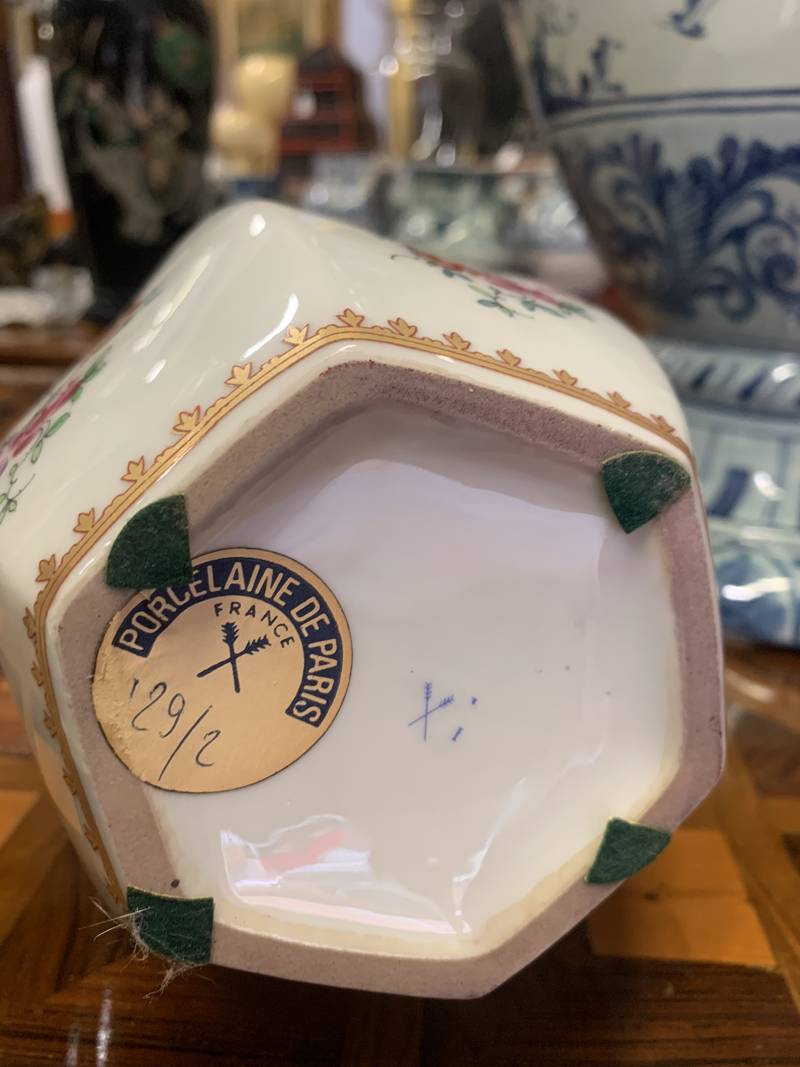 2 antichi vasi da camino porcelaine de Paris epoca XIX secoloa pianta esagonale con corpi ad andamento tortile decorati da sottili tralci in rilievo e da stemma araldico con motto “fortis in bello” circondato da piccoli fiori sparsi dipinti in vivace policromia; coperchio a cupolino sormontato da pignetta dorata
