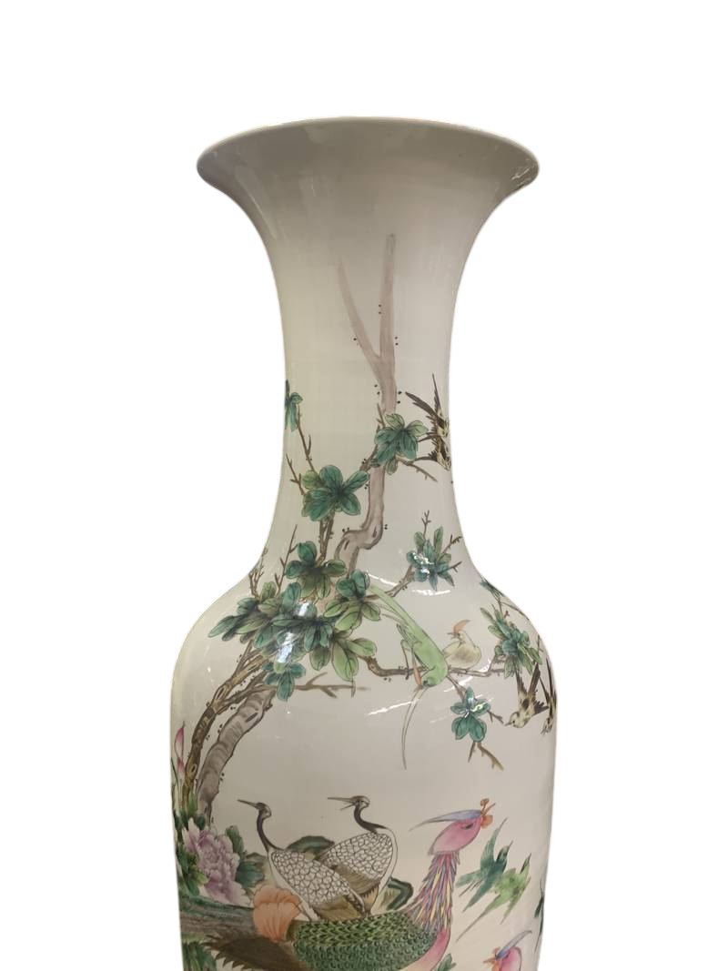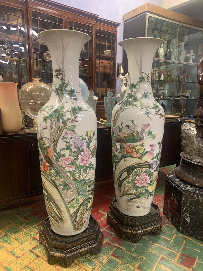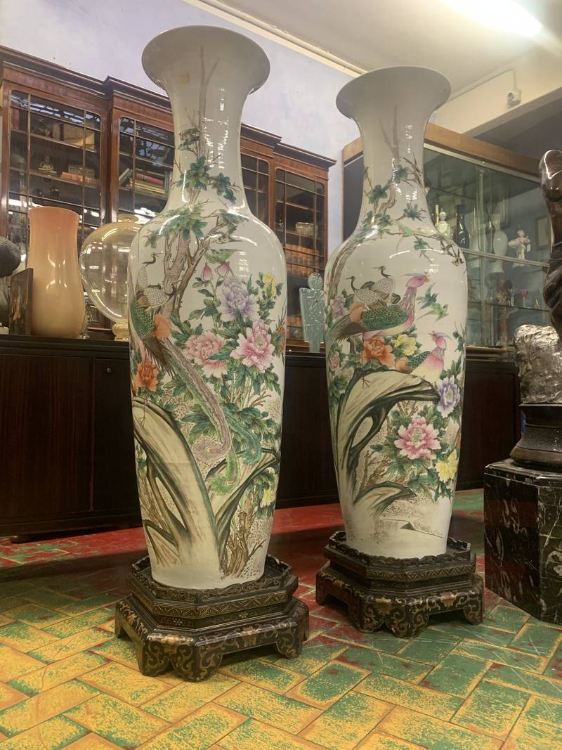 2 grandi vasi Cina con basi in legno lacca nera decori in oro