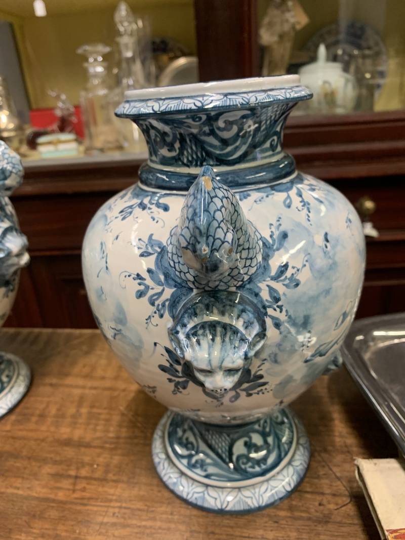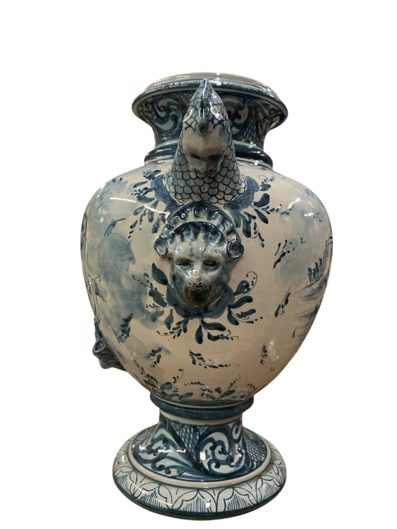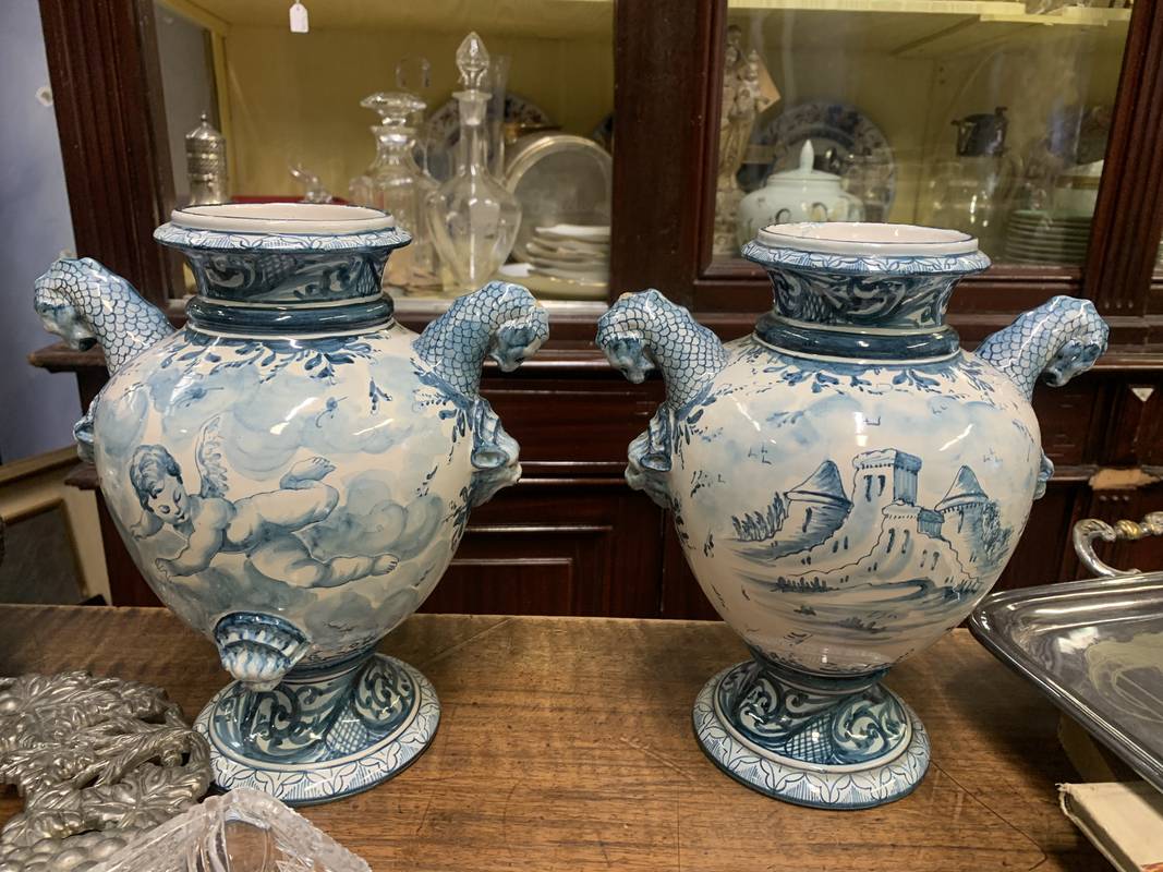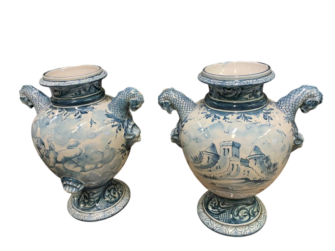 2 vasi bianchi e blu Albisola anse con draghi decori Rinascimentali