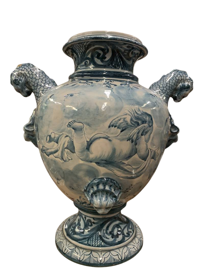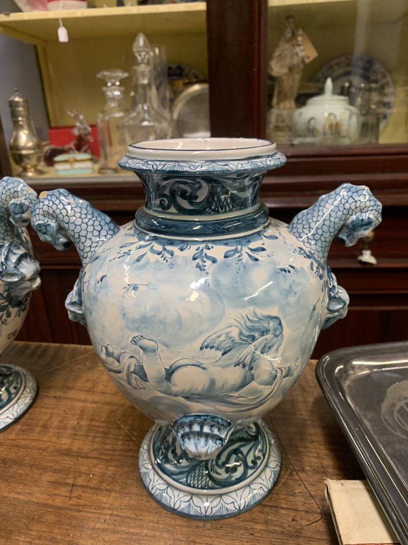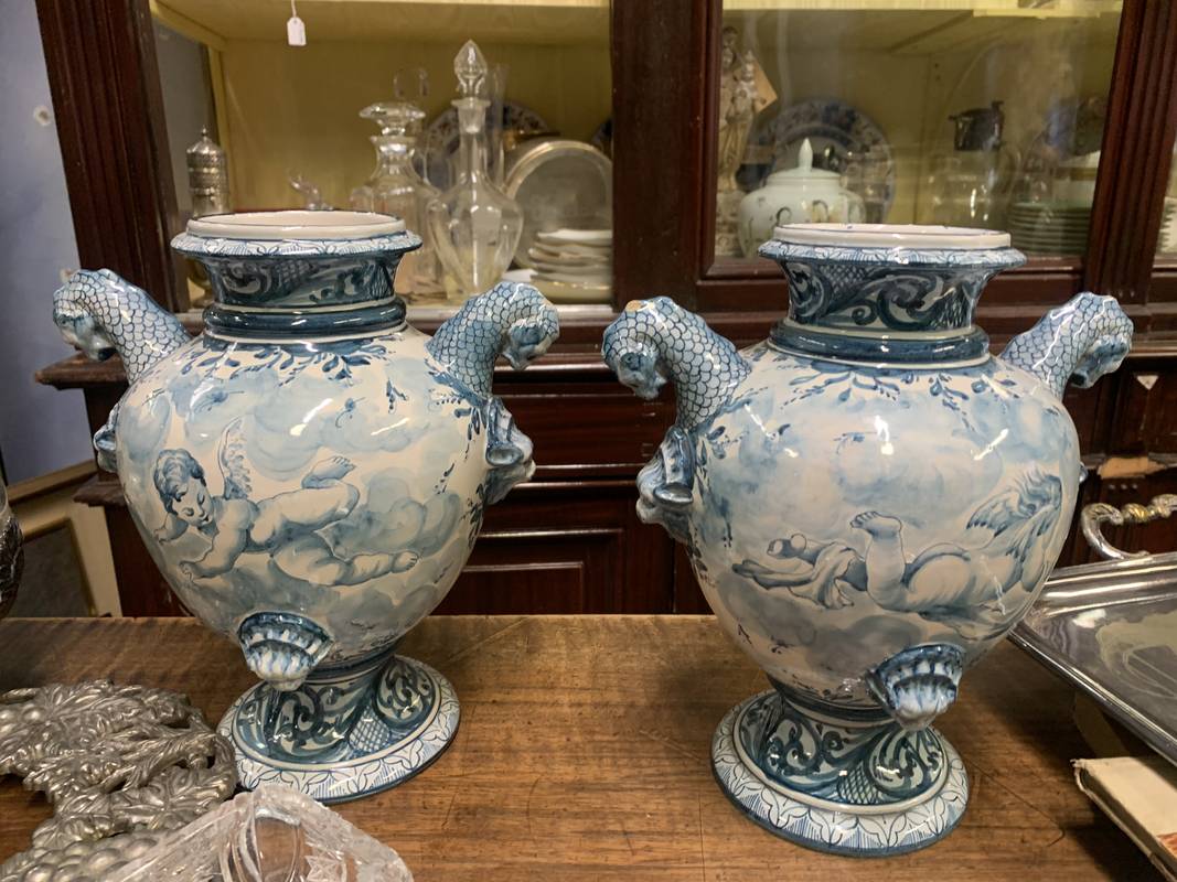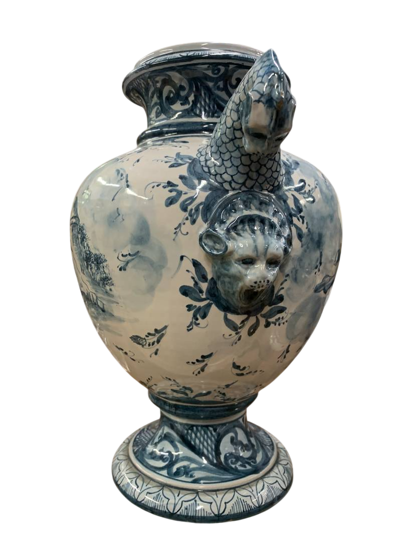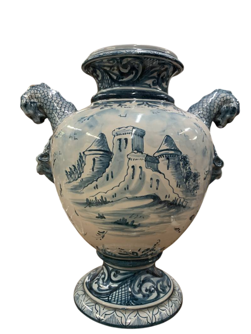 2 vasi bianchi e blu Albisola anse con draghi decori Rinascimentali