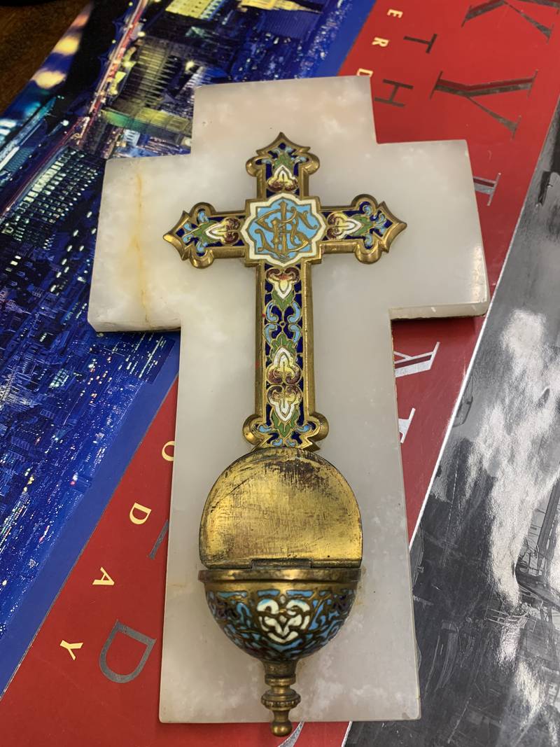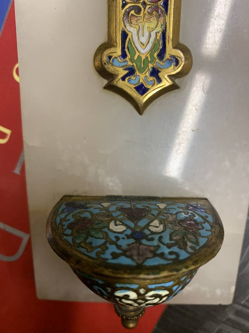 Acquasantiera cloisonnet smalti turchesi su bronzo montato su marmo