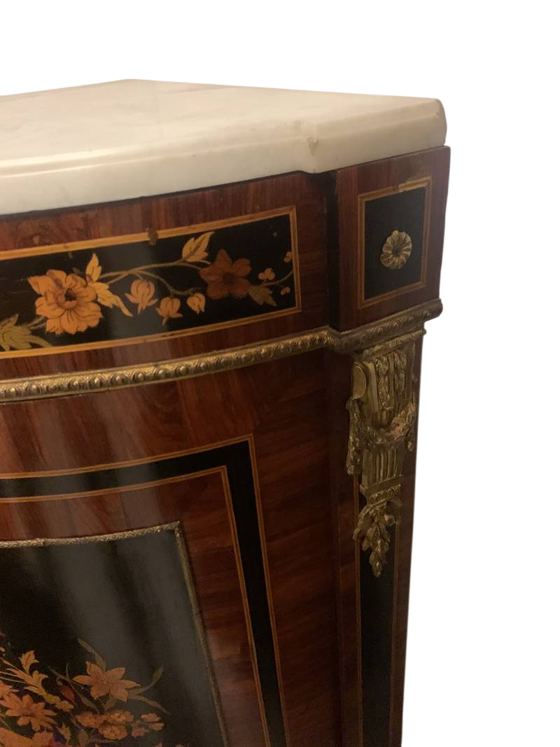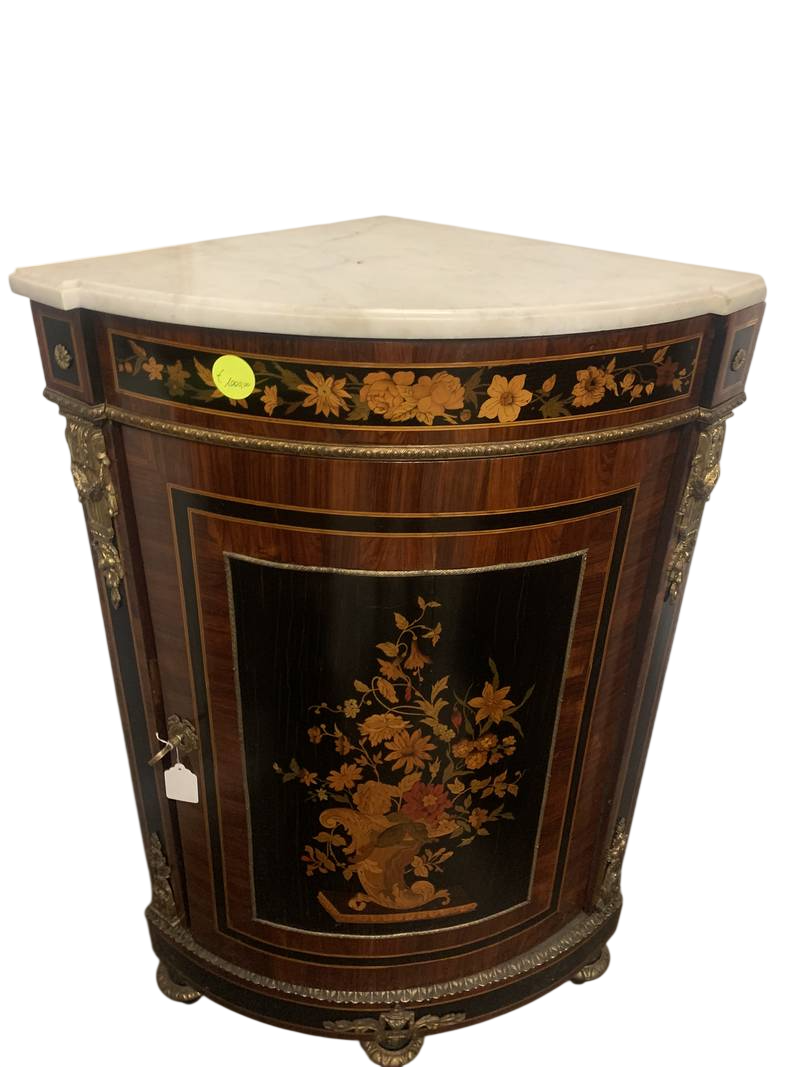 Antica angoliera Napoleone III , finemente intarsiata in varie essenze pregiate, piano in marmo bianco, bronzi dorati finemente cesellati