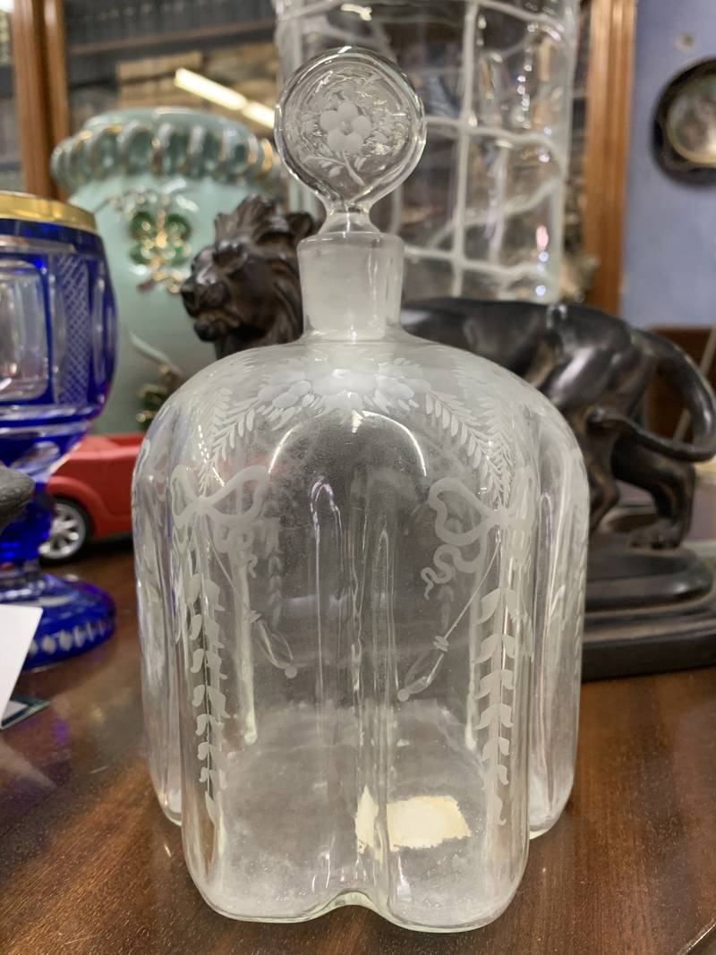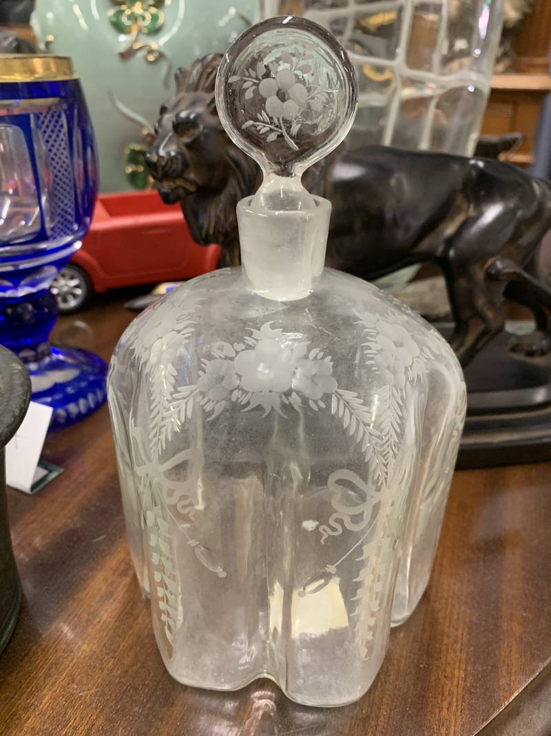Antica ampolla decanter bottiglia in vetro trasparente con decoro floreale Art Nouveau