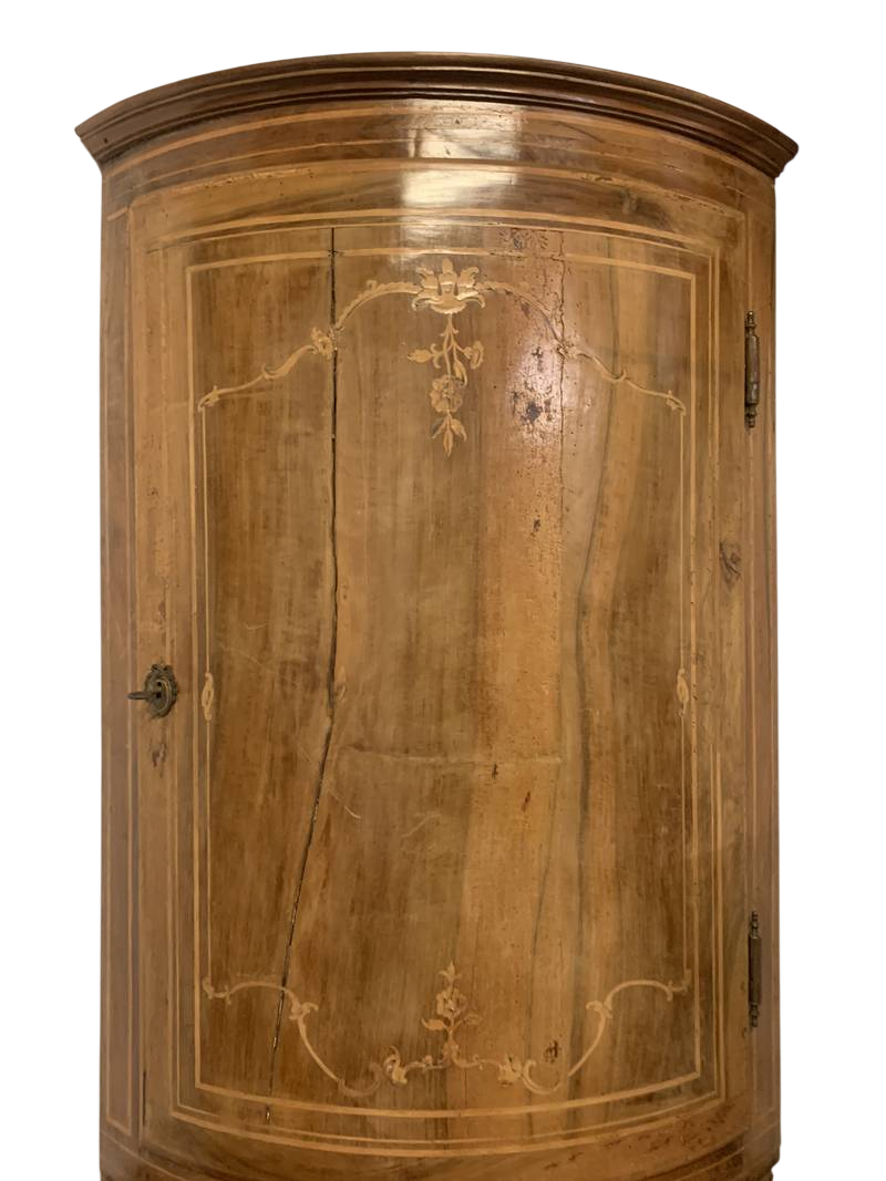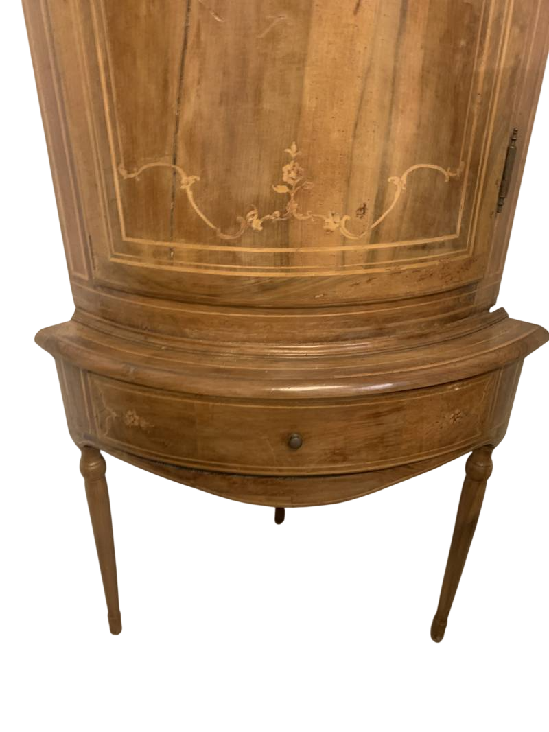 Antica angoliera Luigi XVI bombata in noce intarsiata doppio corpo epoca 700 Piemonte
