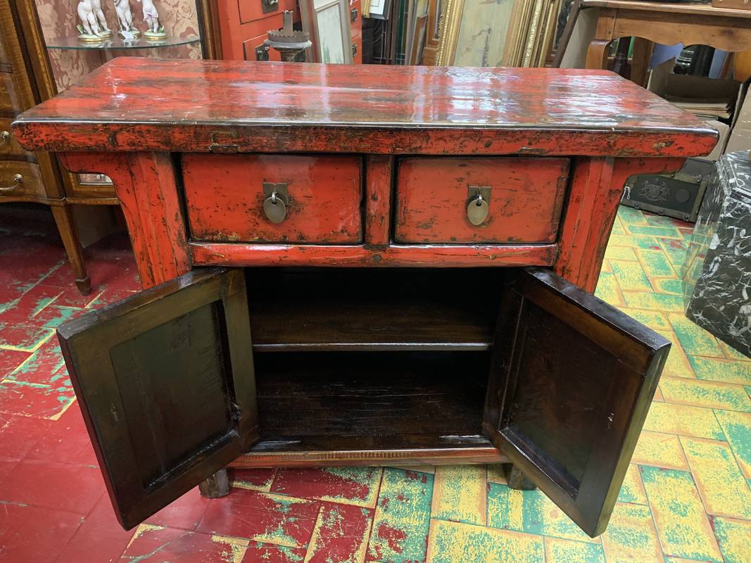 Antica credenza cinese a due ante e due cassetti in lacca rossa