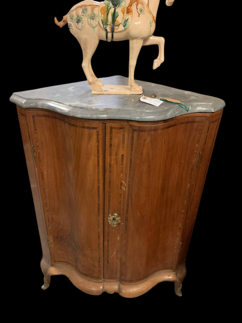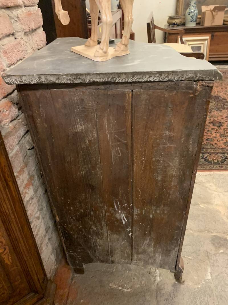 Antica credenza angoliera cantonale in noce intarsiata del 700 secolo piano in marmo Bardiglio