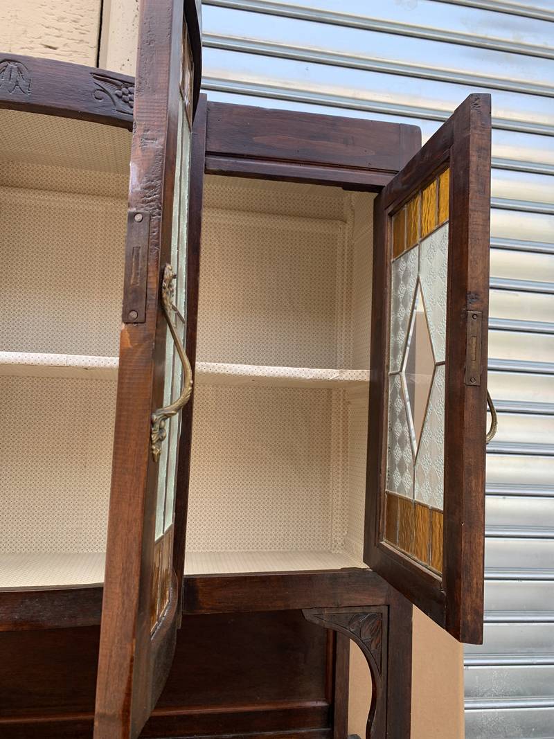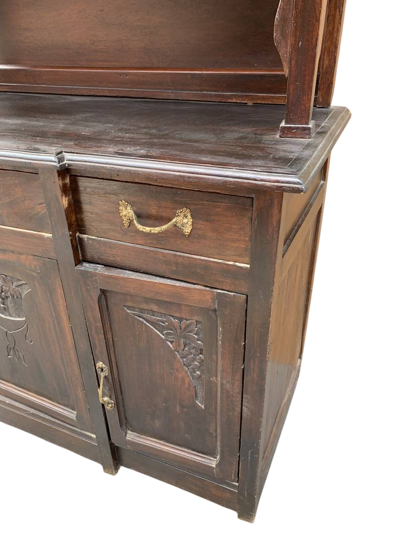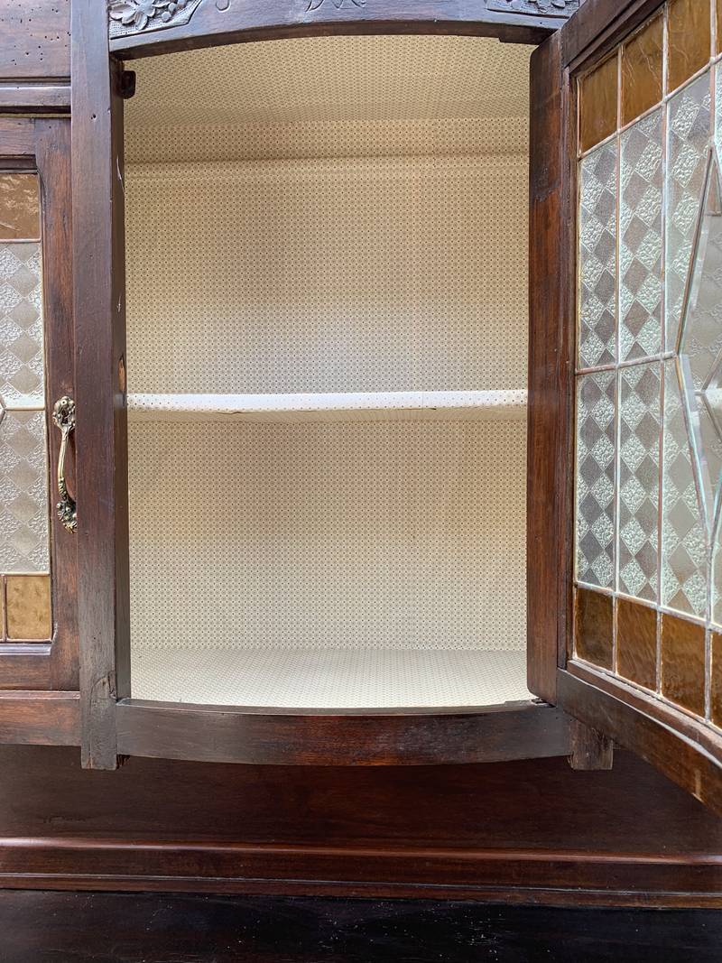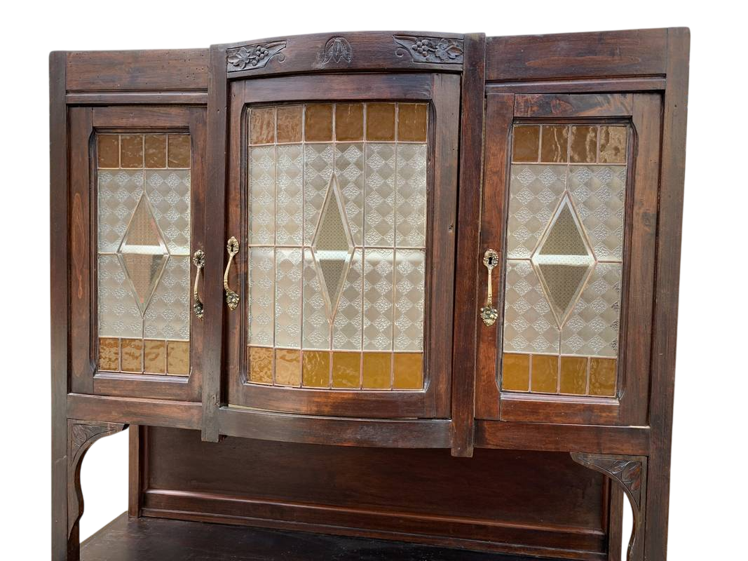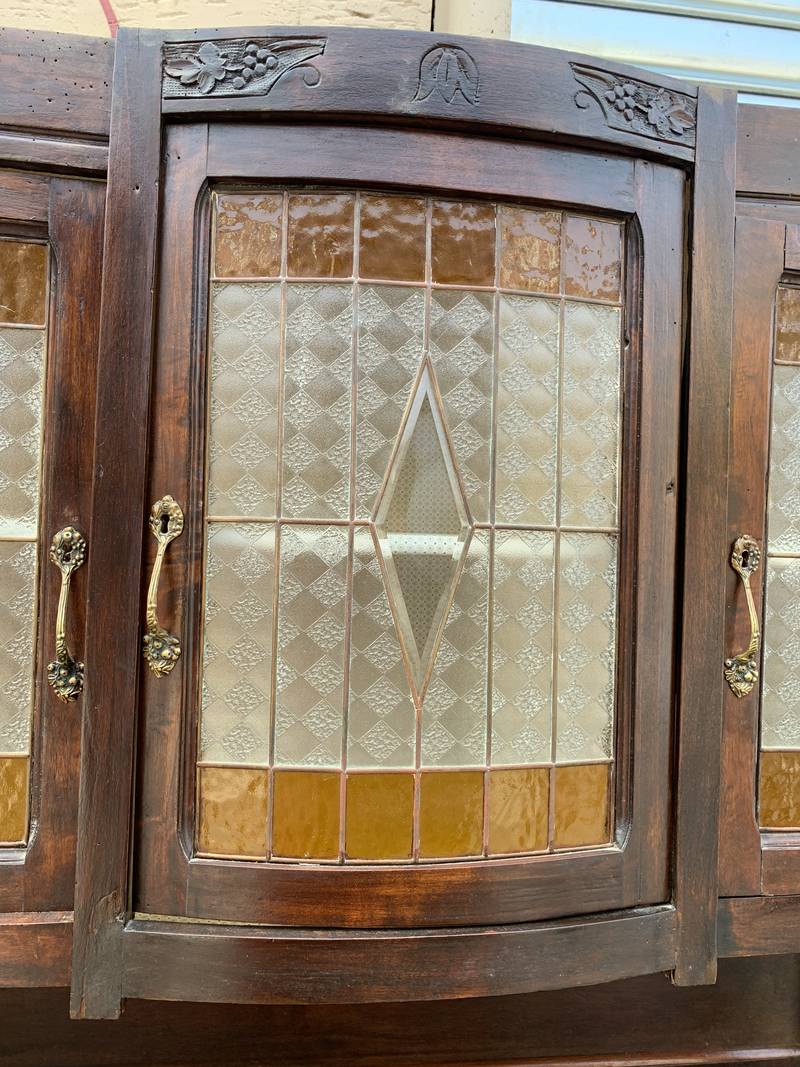 Antica credenza Liberty in legno intagliato con frutta vetri cattedrali