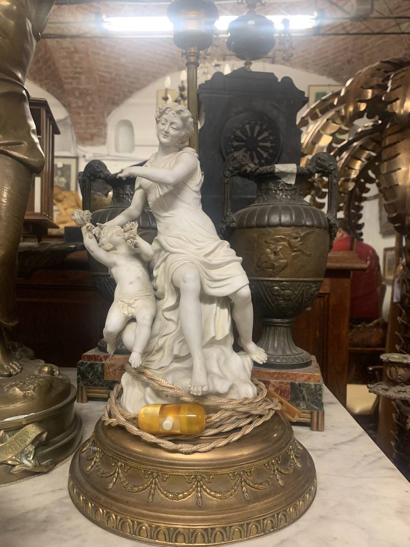 Antica lampada da tavolo in porcellana di biscuit Venere e Cupido Neoclassica su base in bronzo dorato