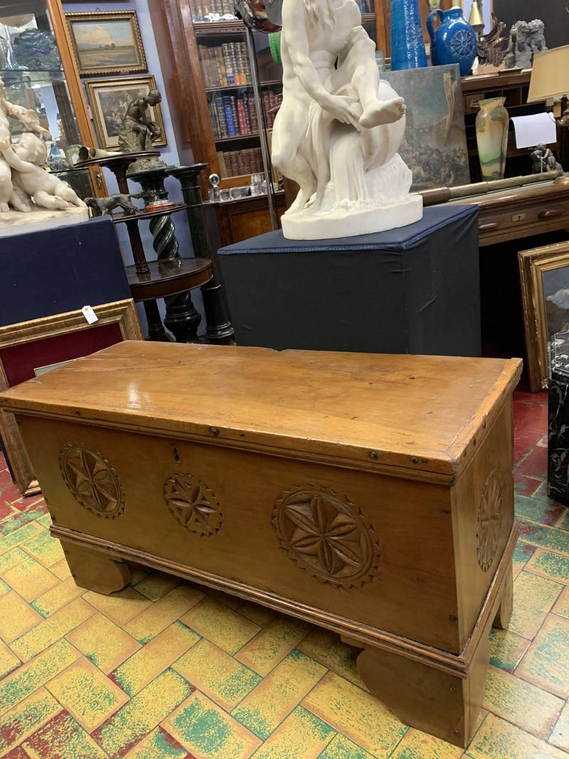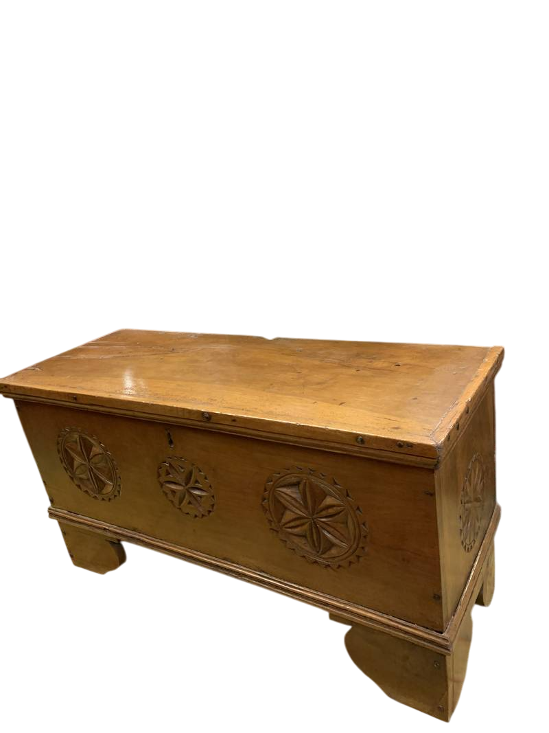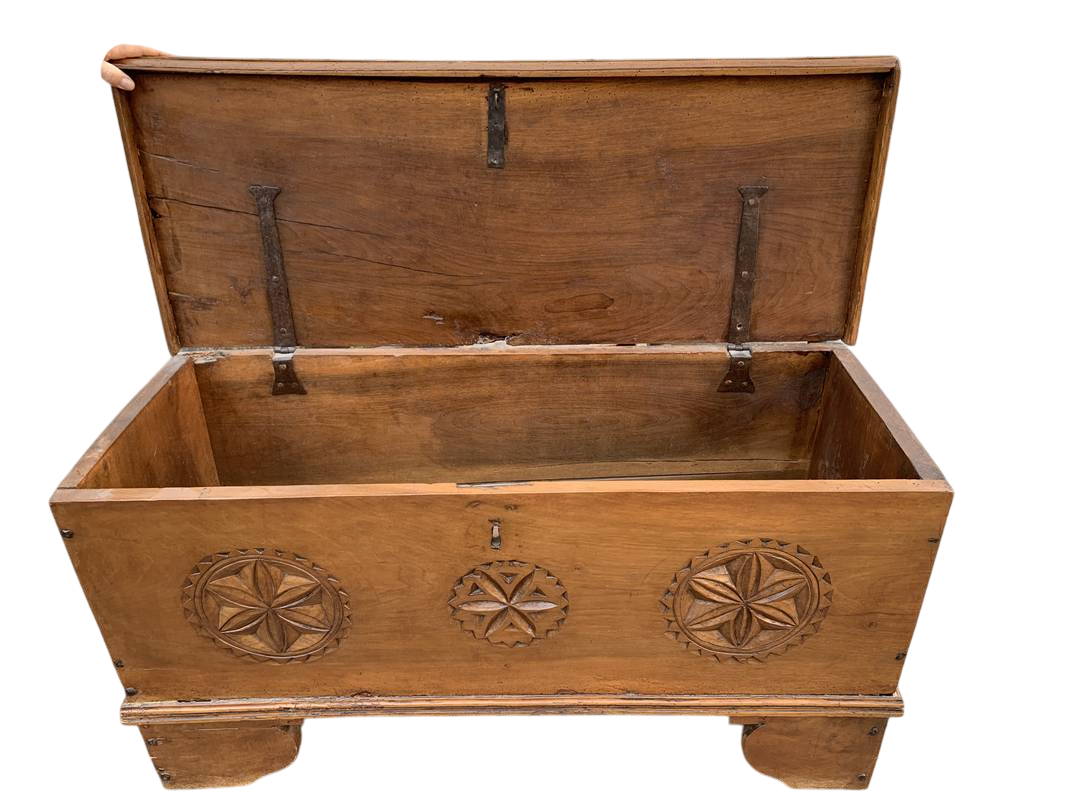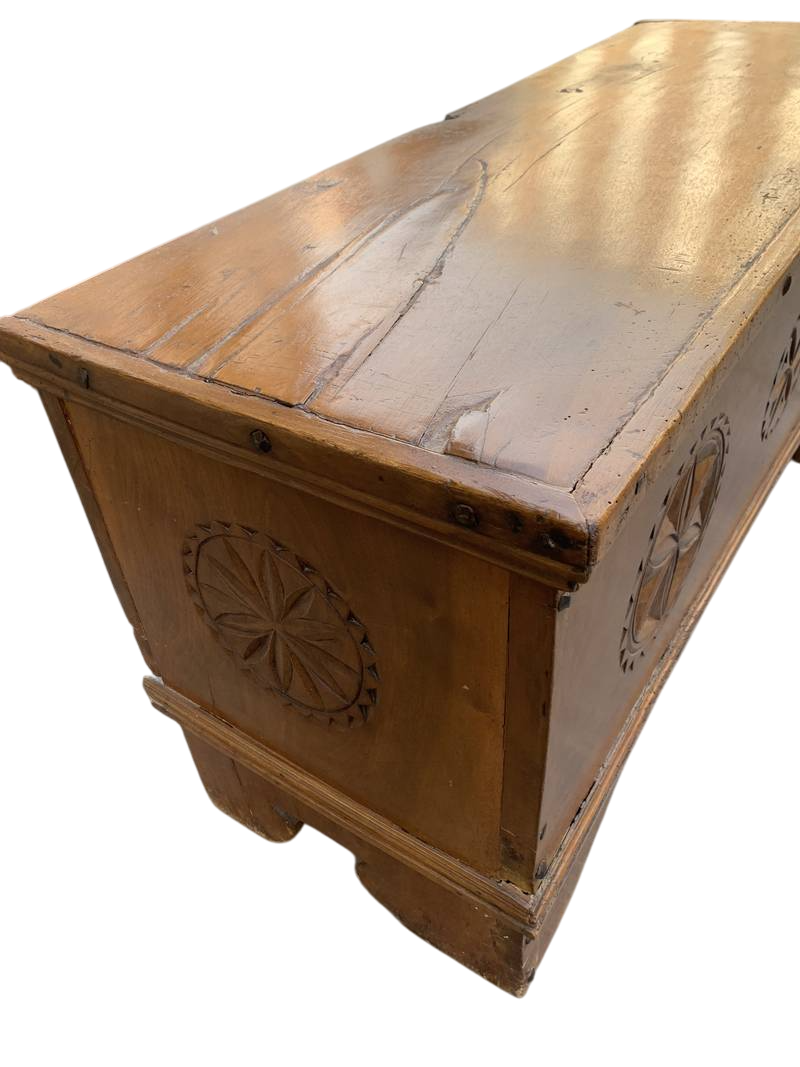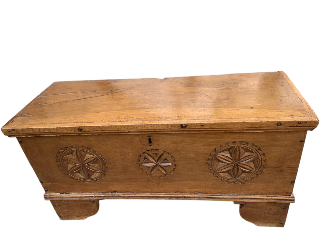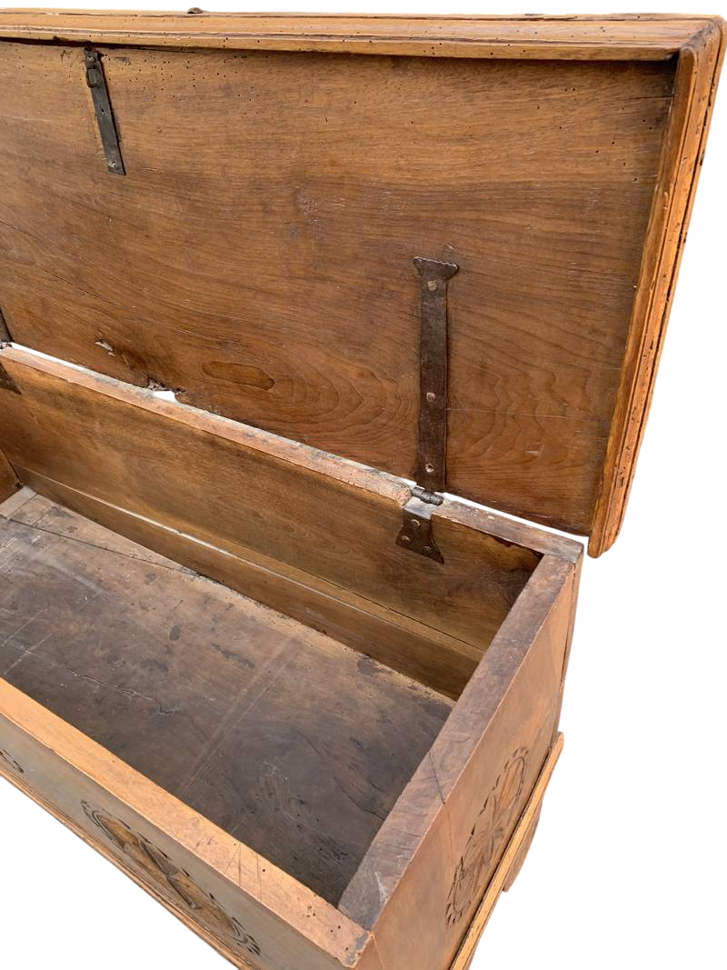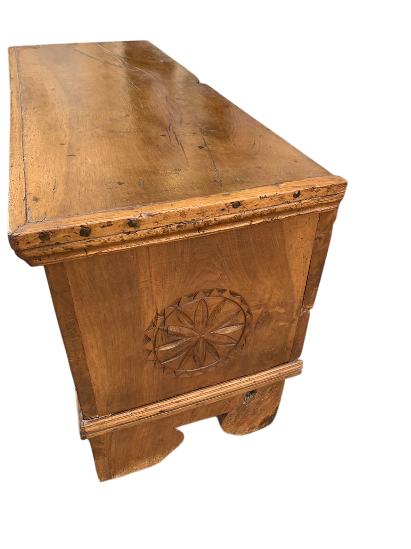 Antica piccola rustica cassapanca in noce intagliata Val Varaita del 700