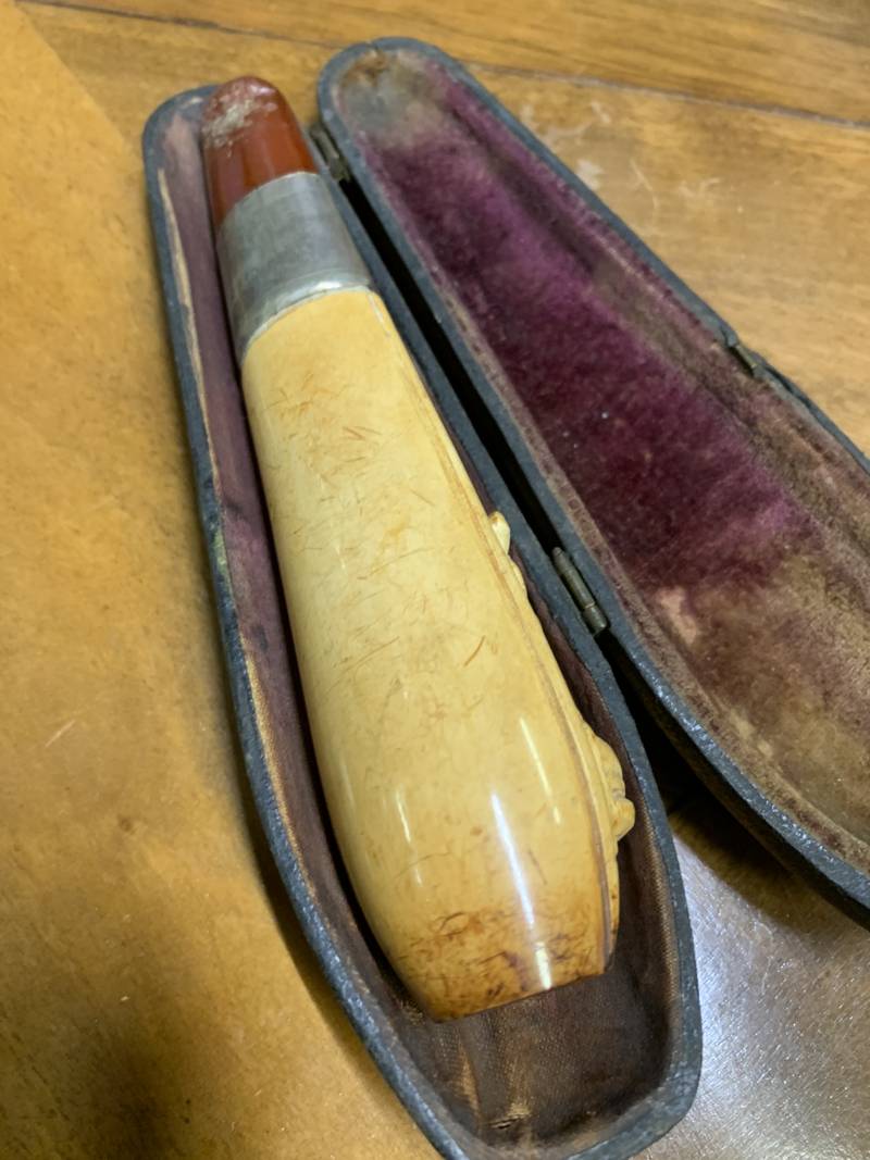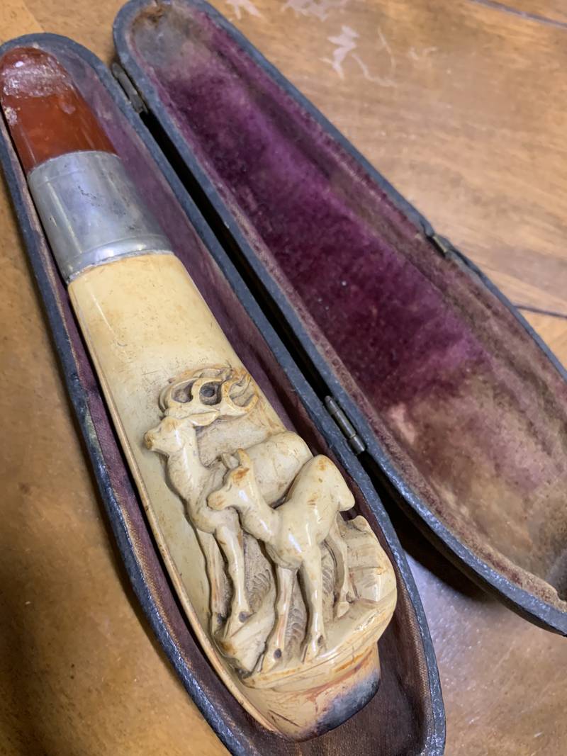 una preziosa pipa da collezione in schiuma di mare (meerschaum). intaglio dettagliato di una cerva con il suo cerbiatto. È contenuta in un astuccio foderato di velluto viola,
