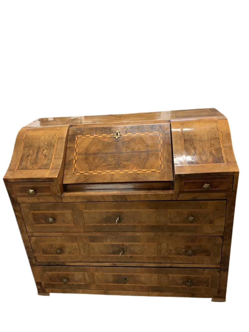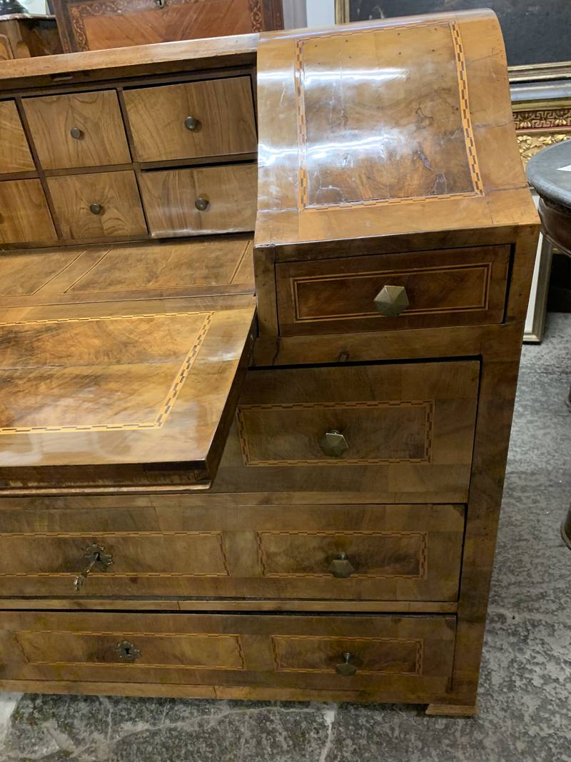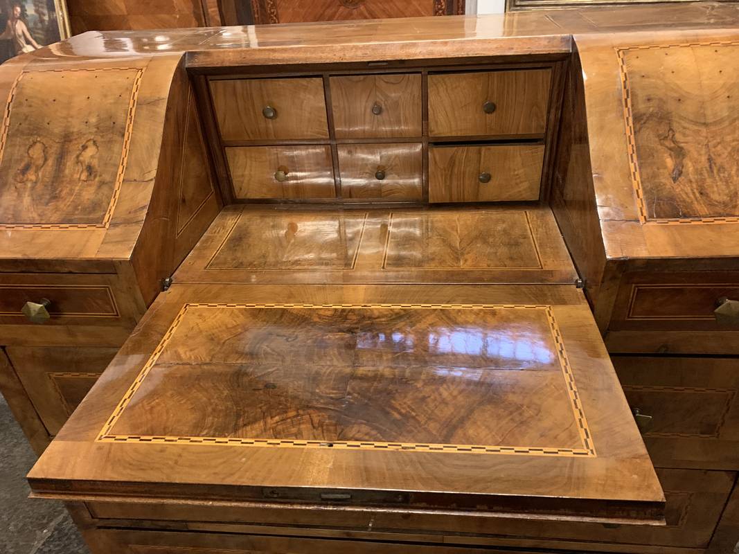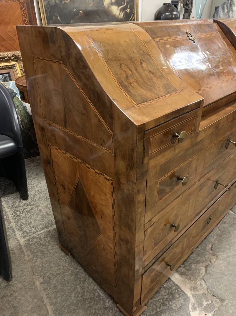 Antico cassettone con ribalta intarsiata Veneta epoca 700 noce e radica di noce