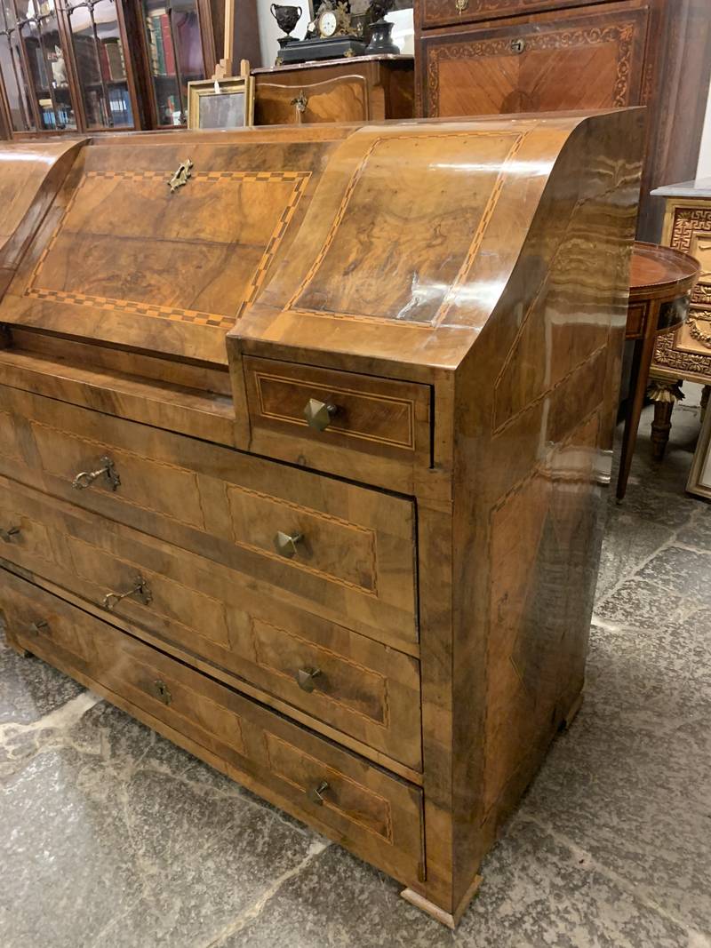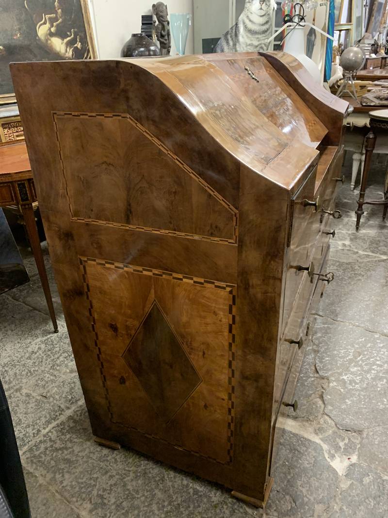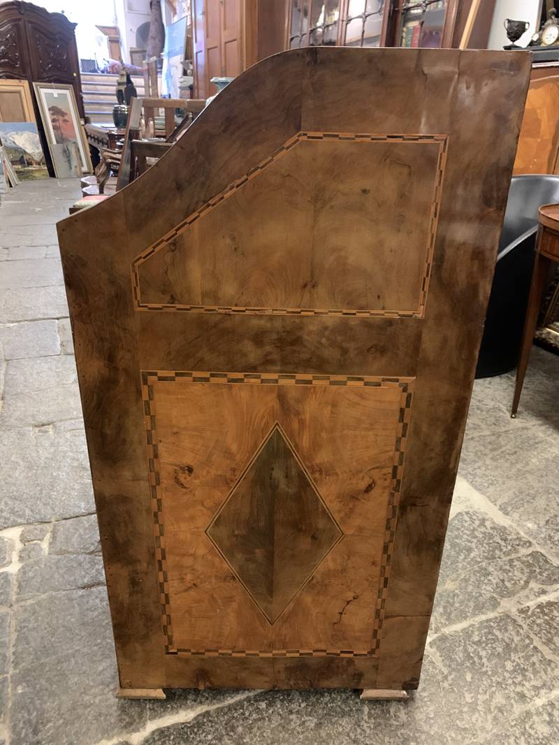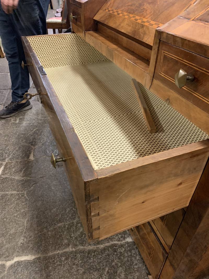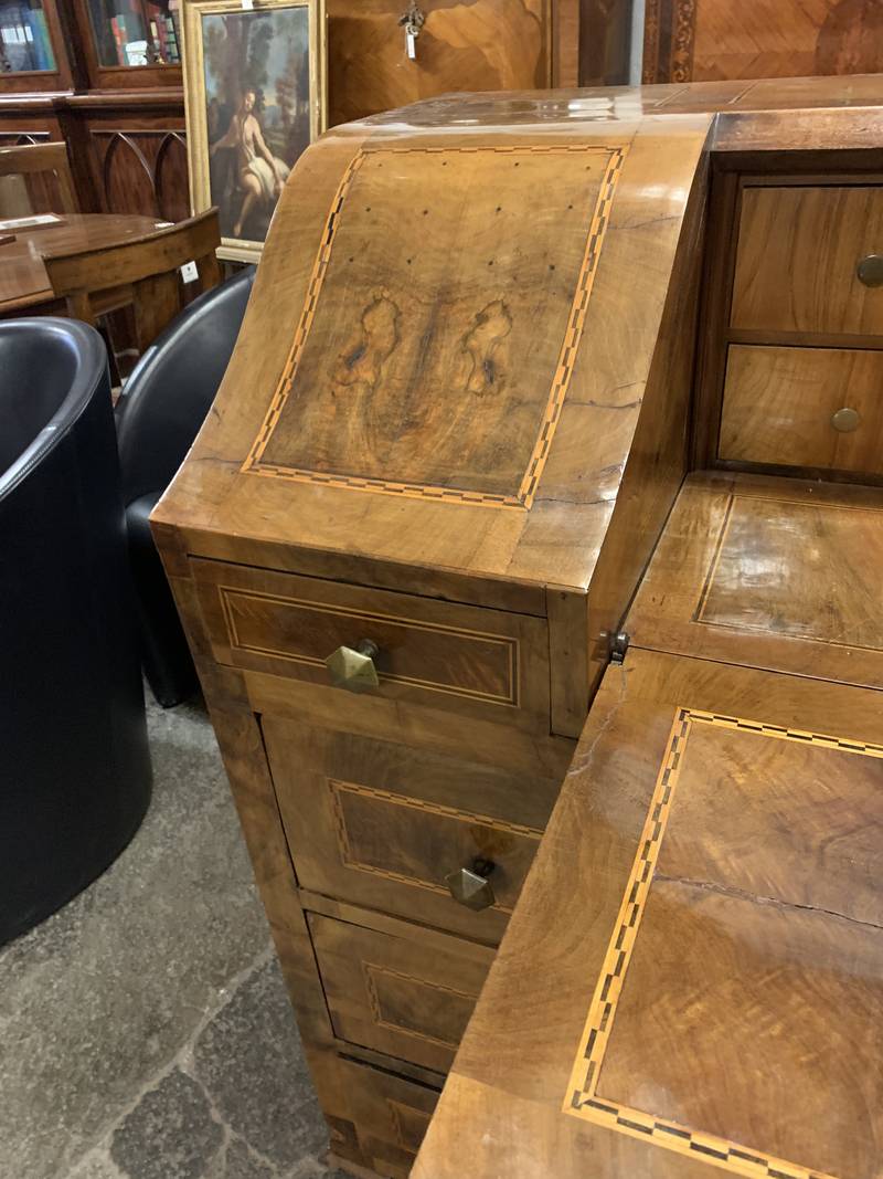 Antico cassettone con ribalta intarsiata Veneta epoca 700 noce e radica di noce