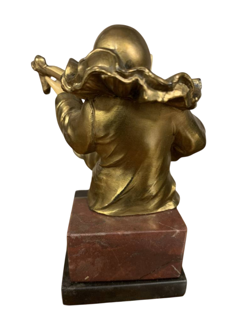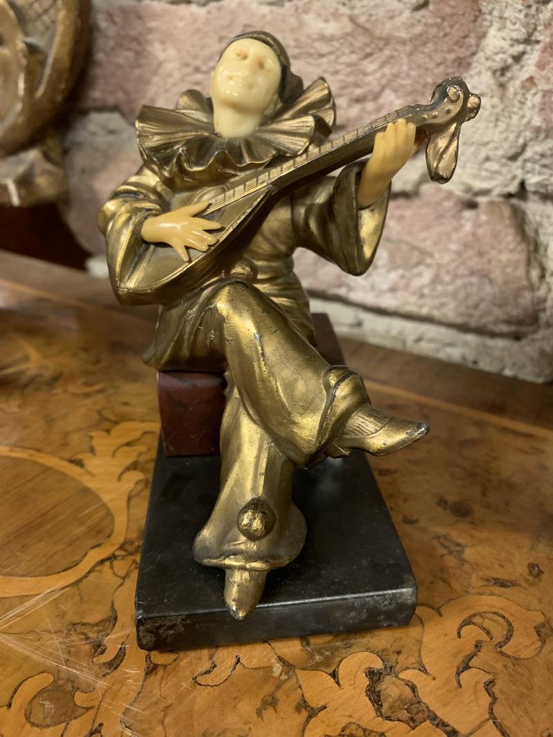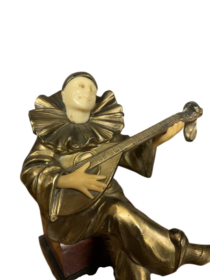 Antica scultura statuetta in bronzo dorato Pierrot che suona il mandolino Art Deco’ su base in marmo