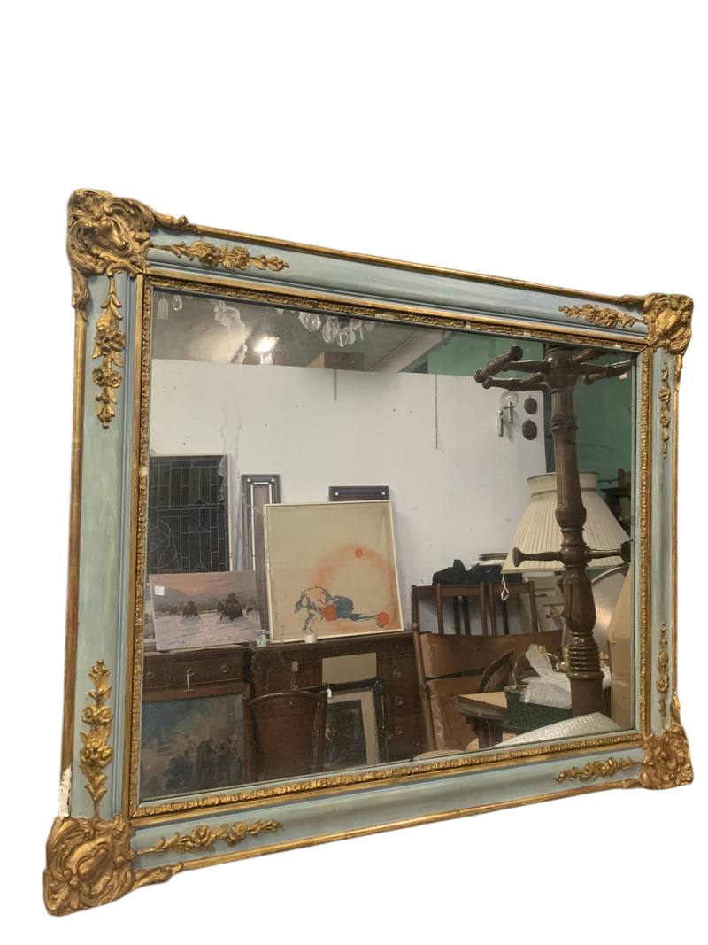 Antica specchiera dell’800 Neoclassica cornice in lacca azzurra con decori a volute dorate