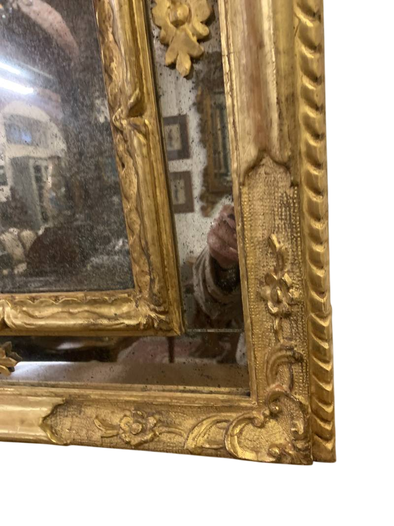 La cornice è intagliata con dettagli floreali e motivi a foglia d’acanto. Lo specchio interno è coevo.