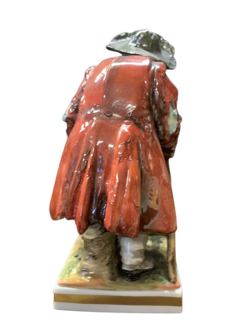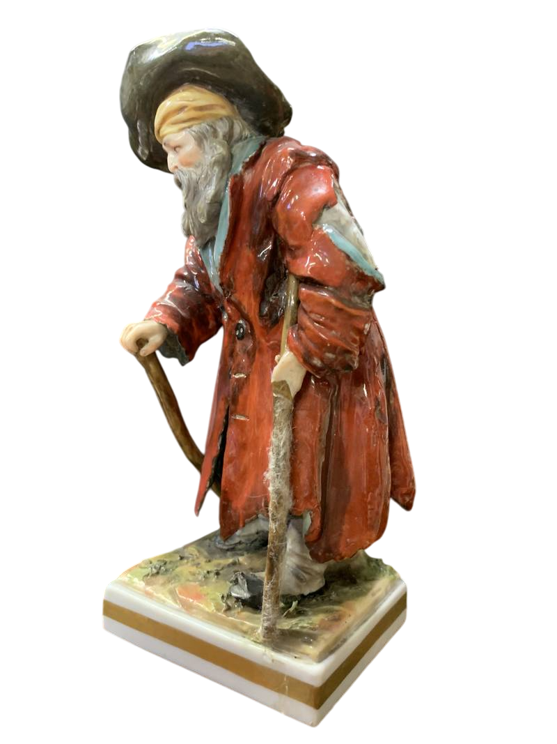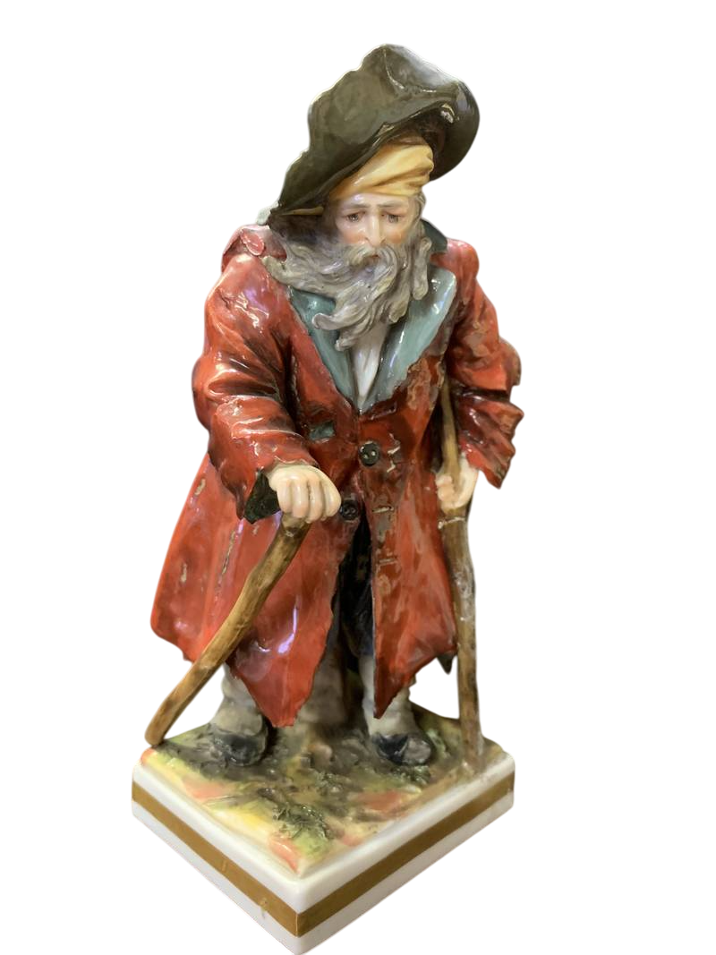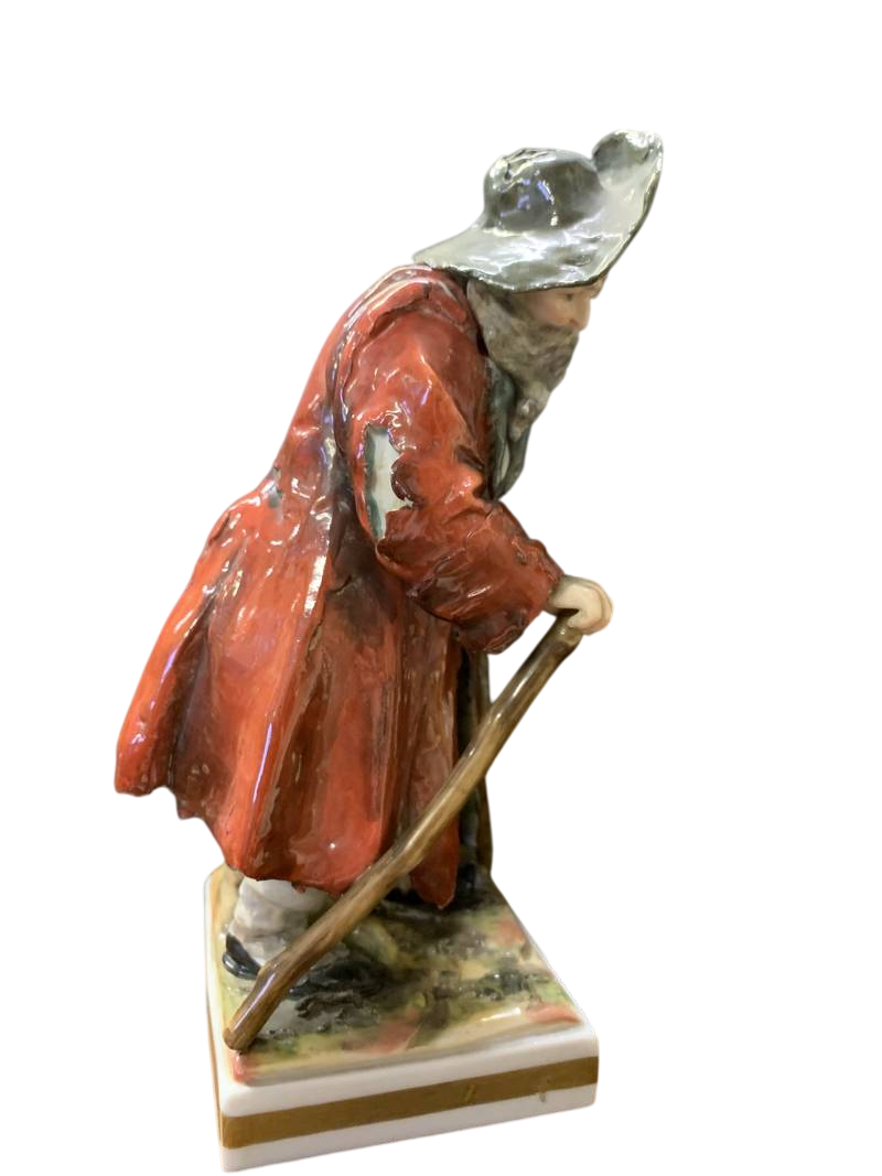 Antica statuina porcellana tedesca mendicante con bastoni epoca XIX secolo