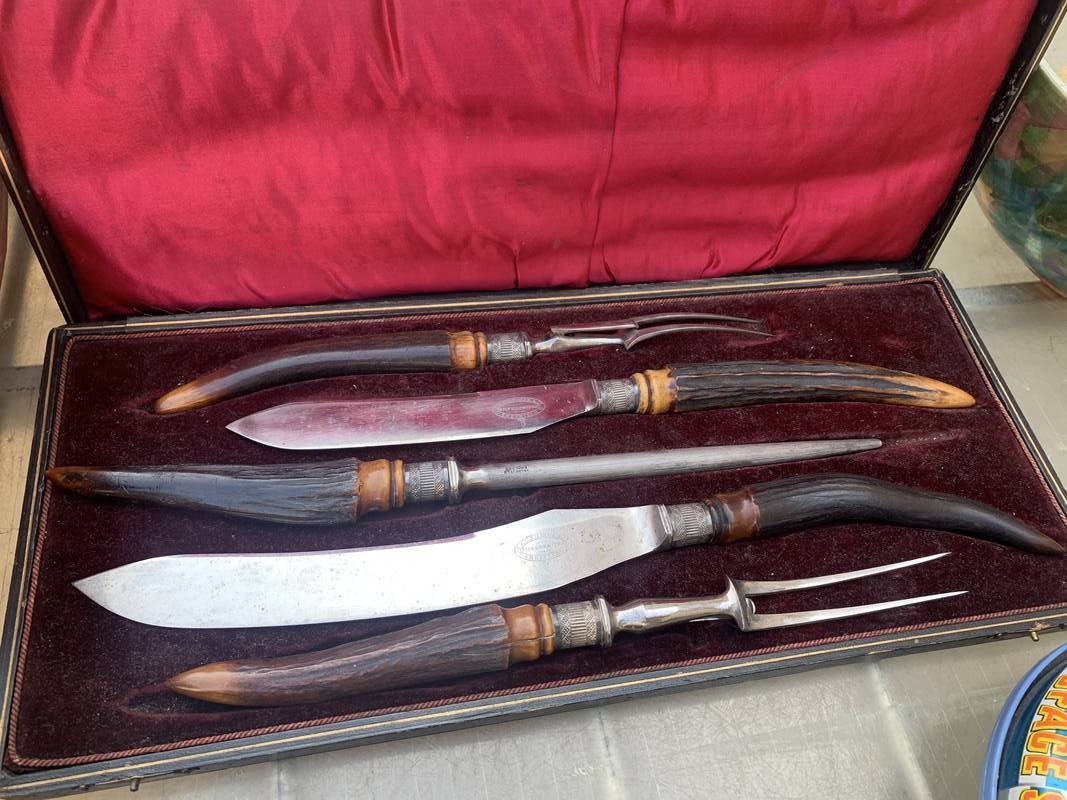 antiche grandi posate per arrosto con manici in corno di cervo Inghilterra