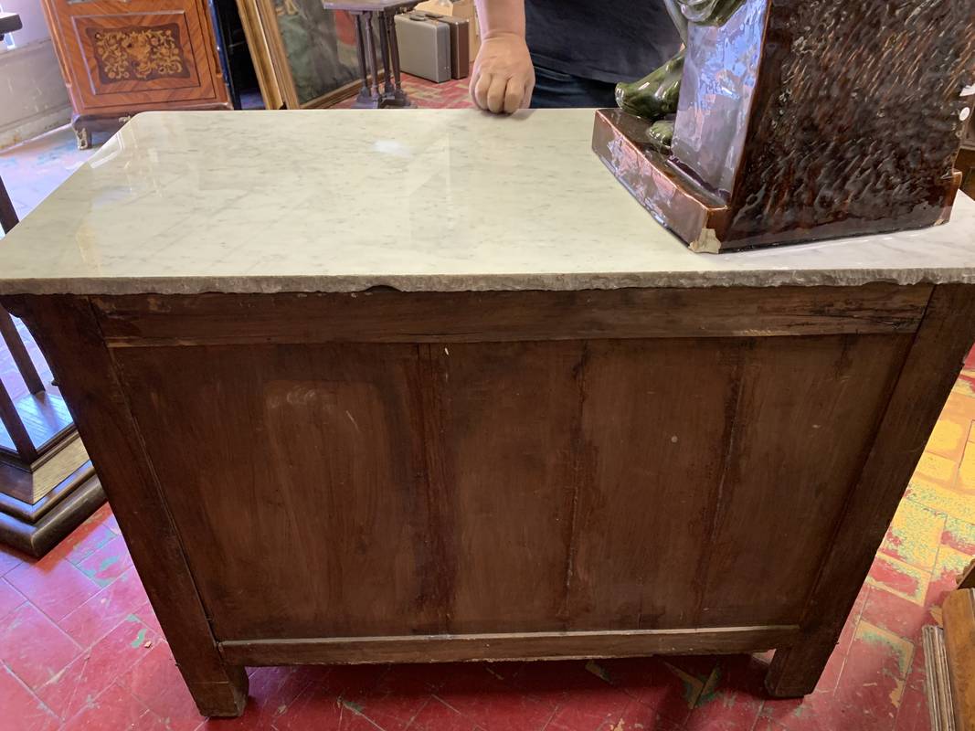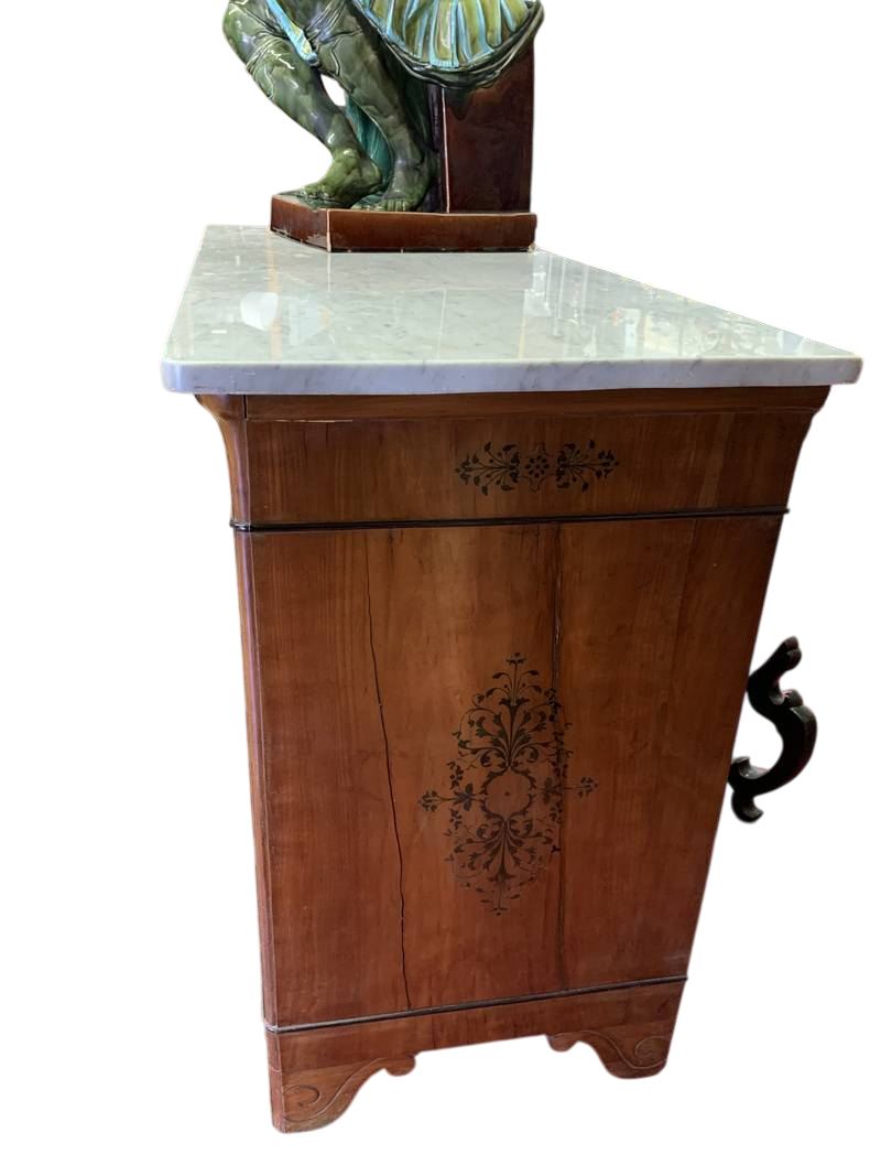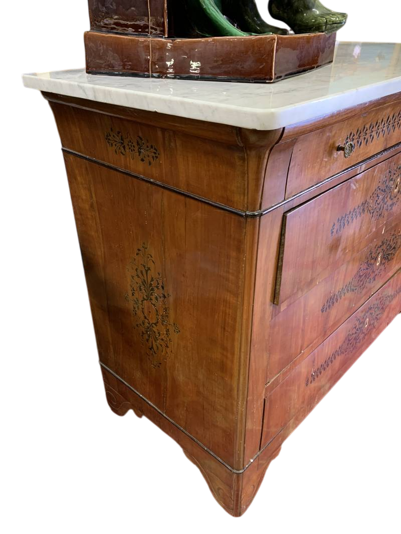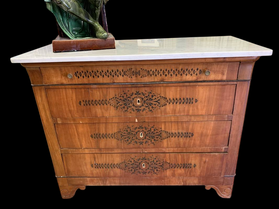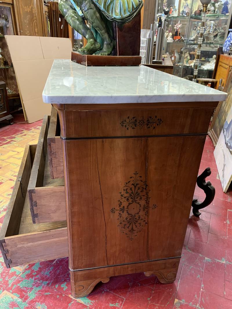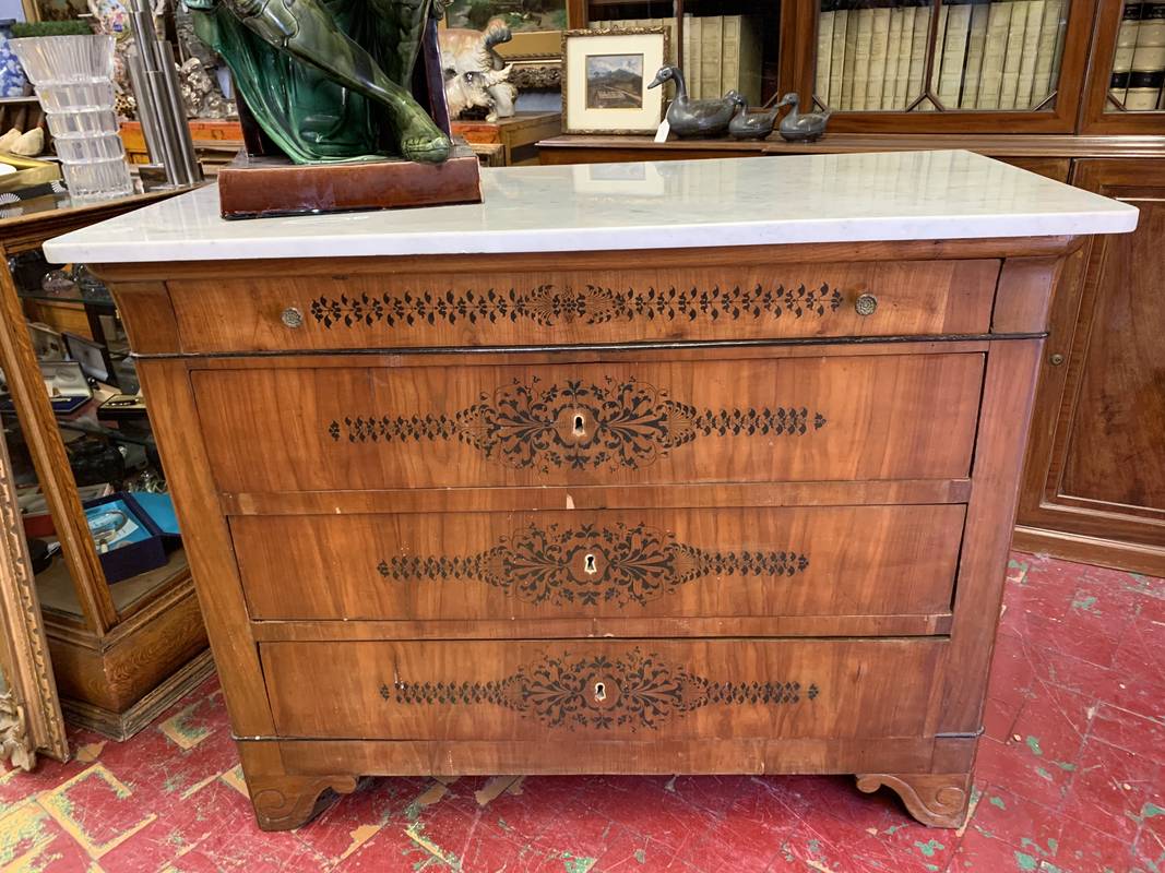 Cassettone Carlo X intarsiato epoca XIX secolo finemente intarsiato sul fronte e sui fianchi , piano in marmo prima patina epoca