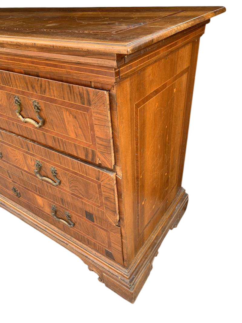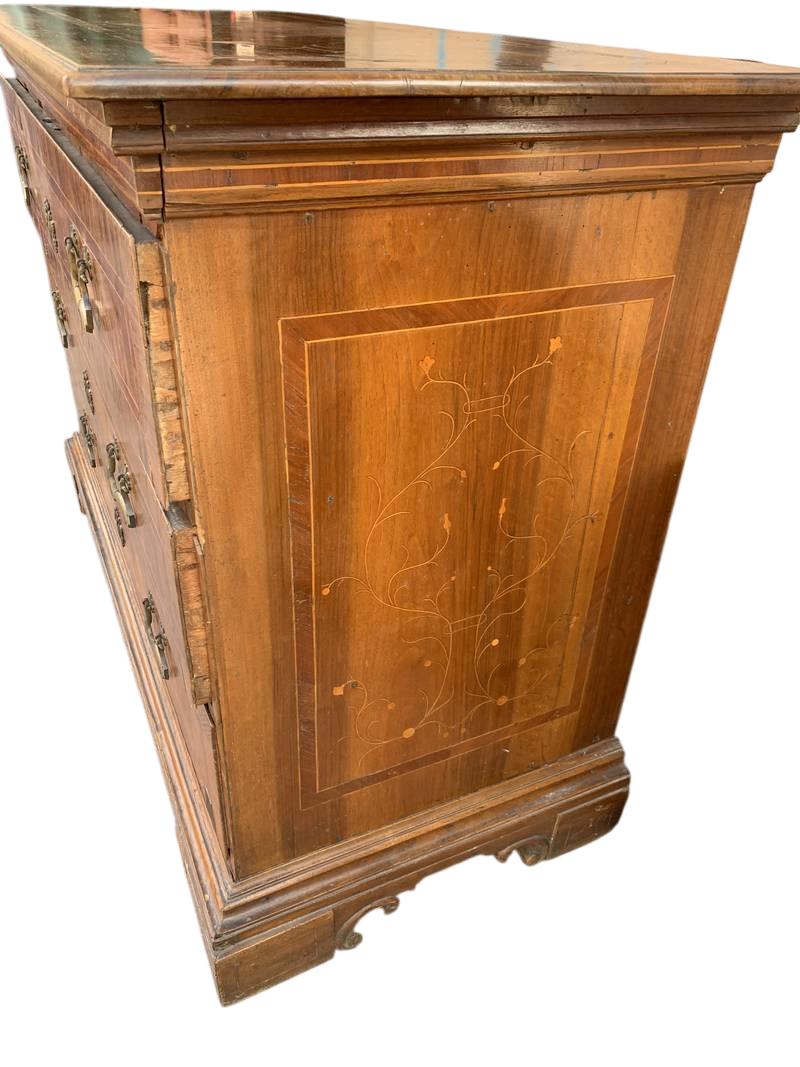 Antico cassettone canterano del 700 lombardo in noce con pregiati intarsi e filettature.