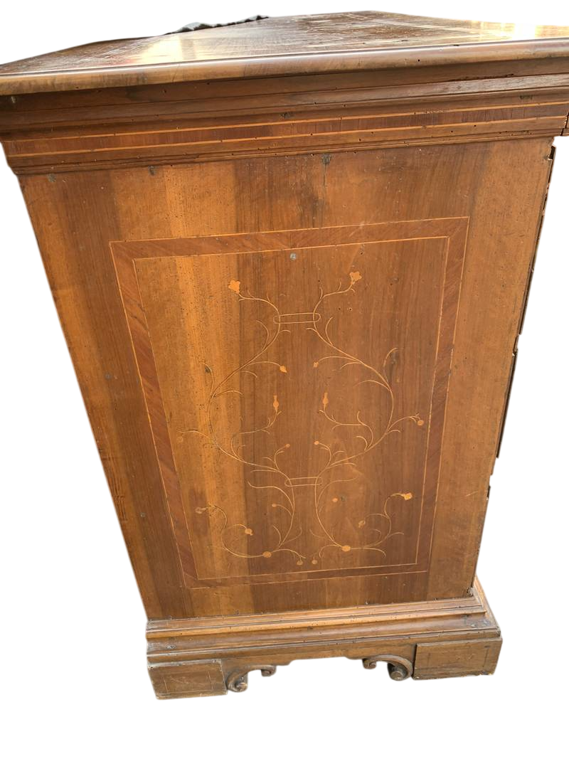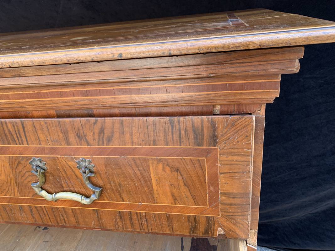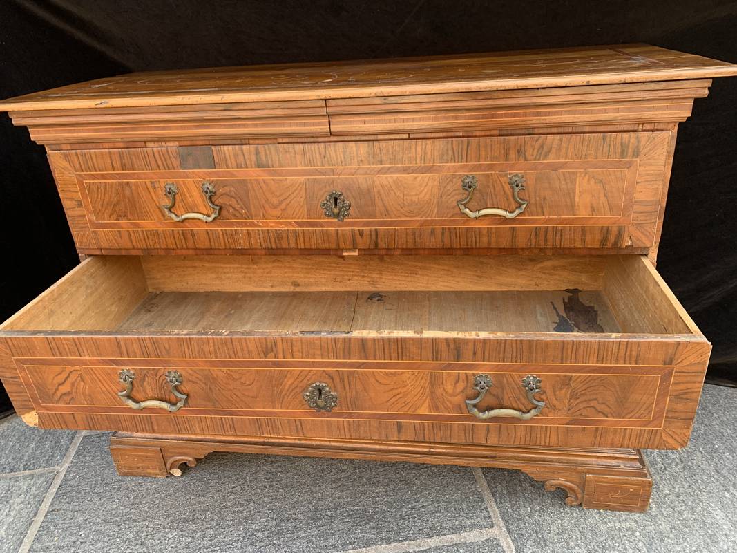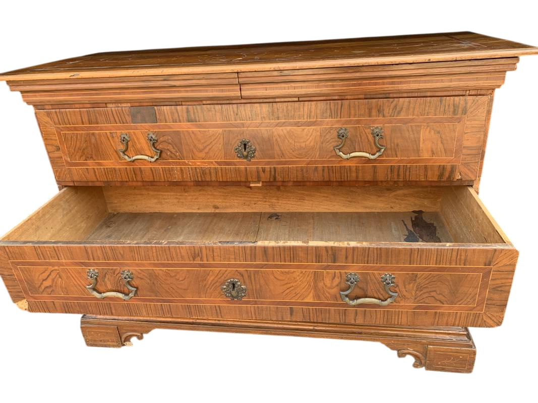 Antico Cassettone in noce lastronato ed intarsiato del 700 lombardo