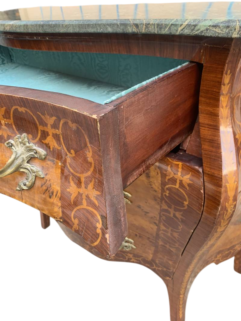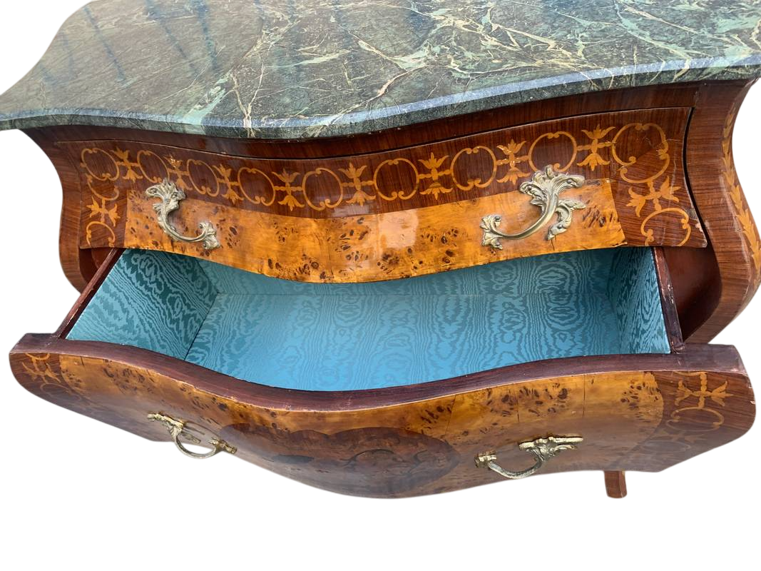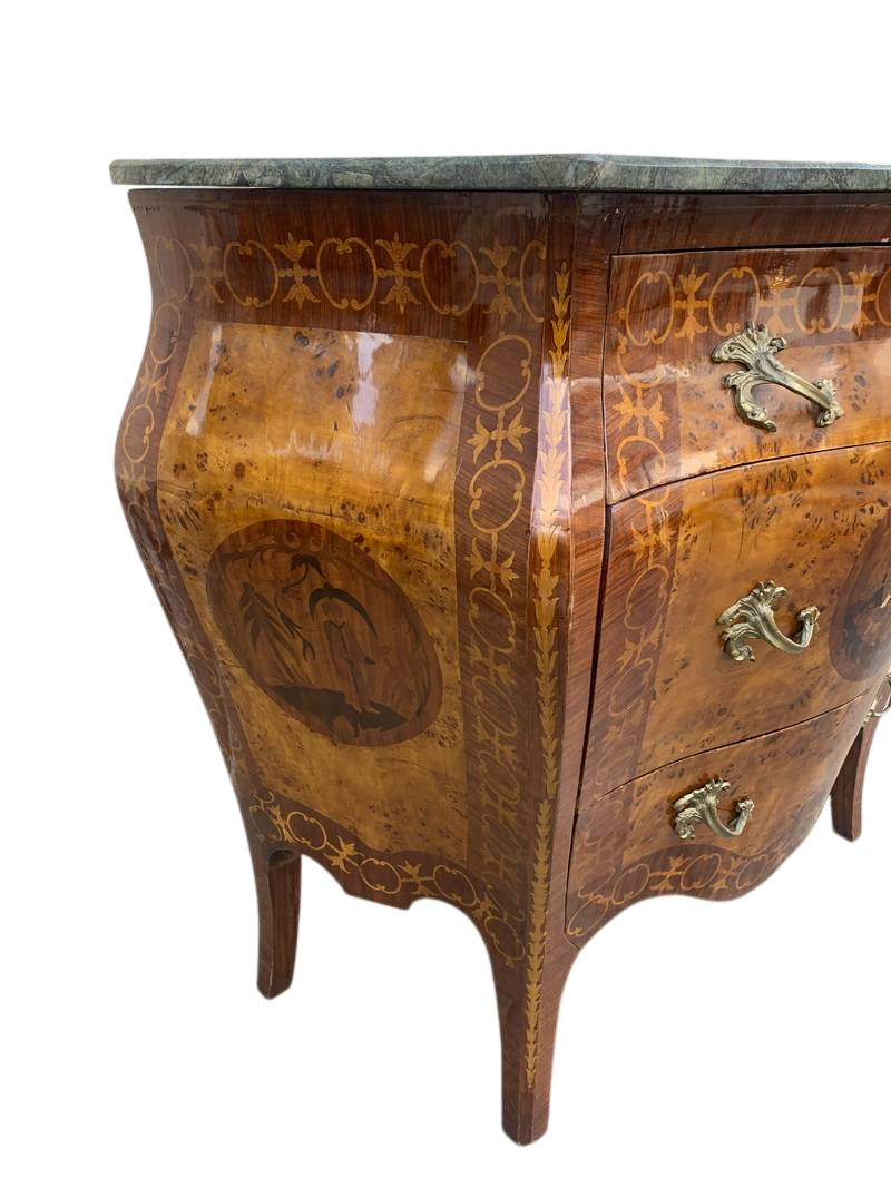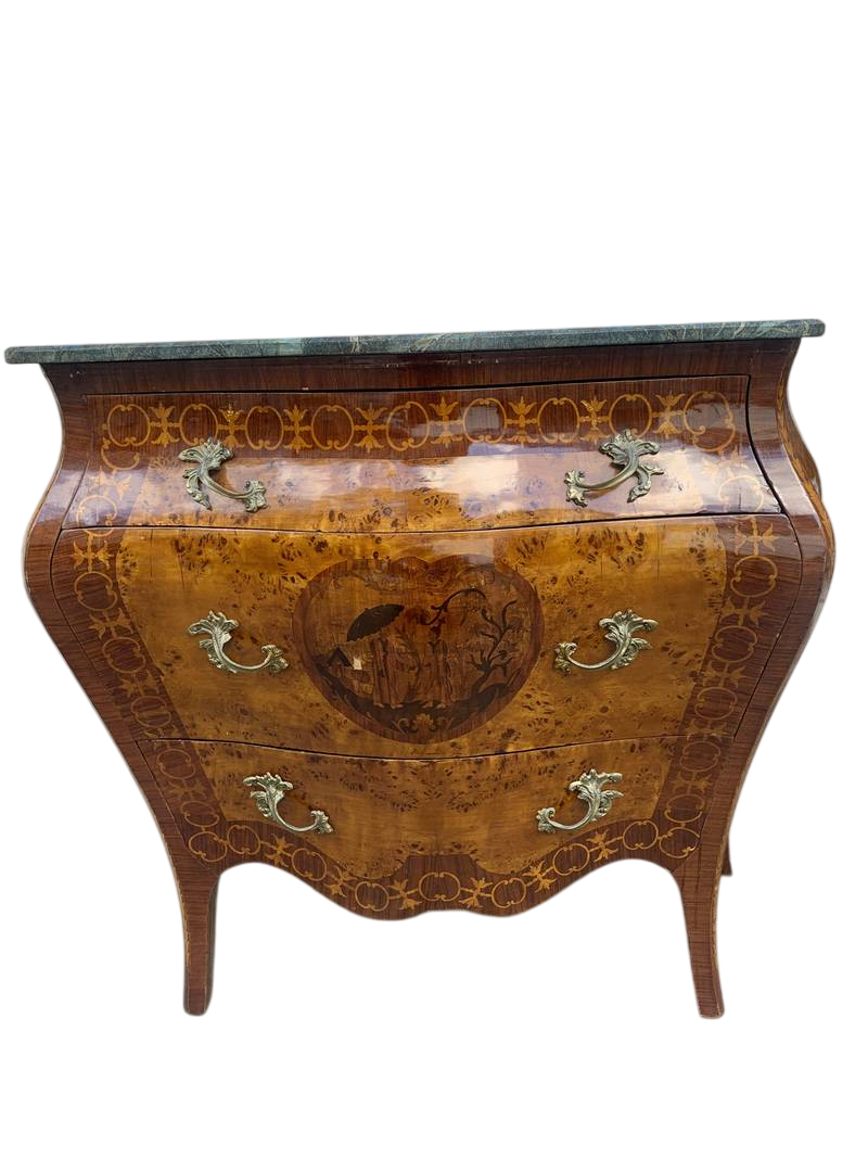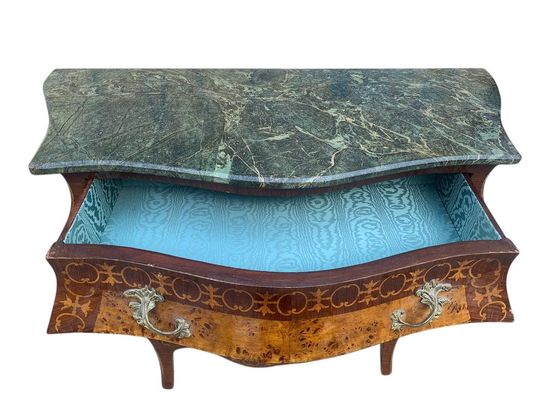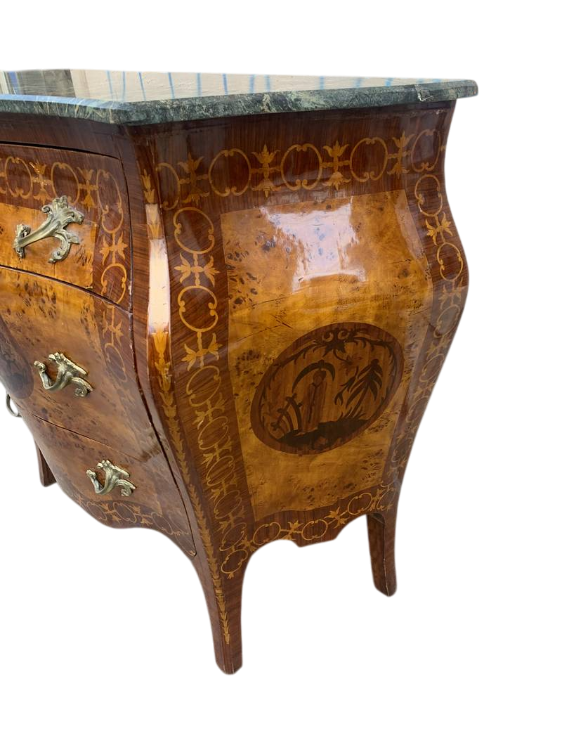 Antico cassettone mosso finemente intarsiato sul fronte , sui fianchi