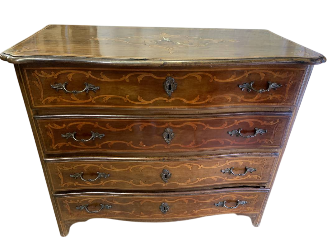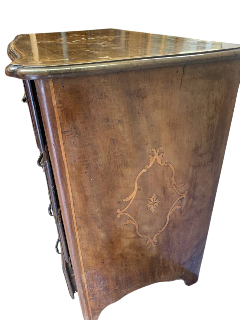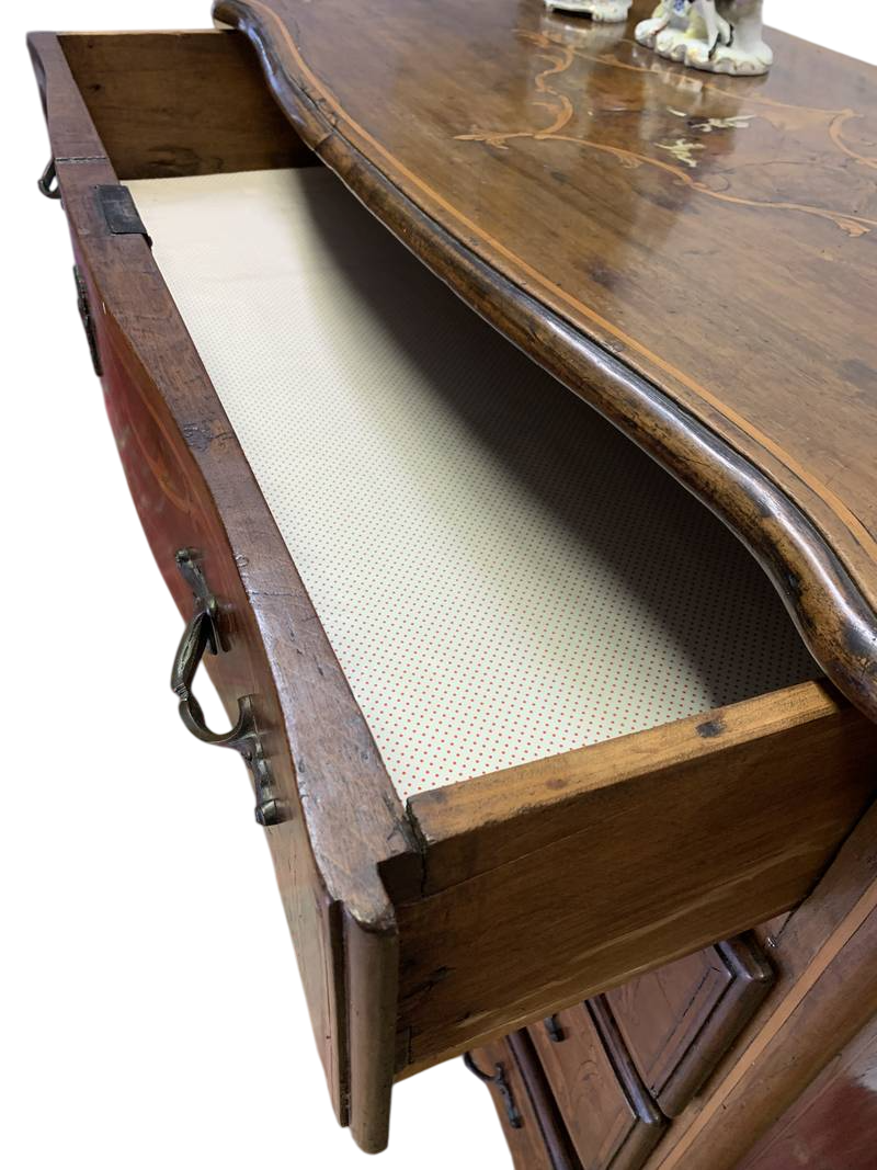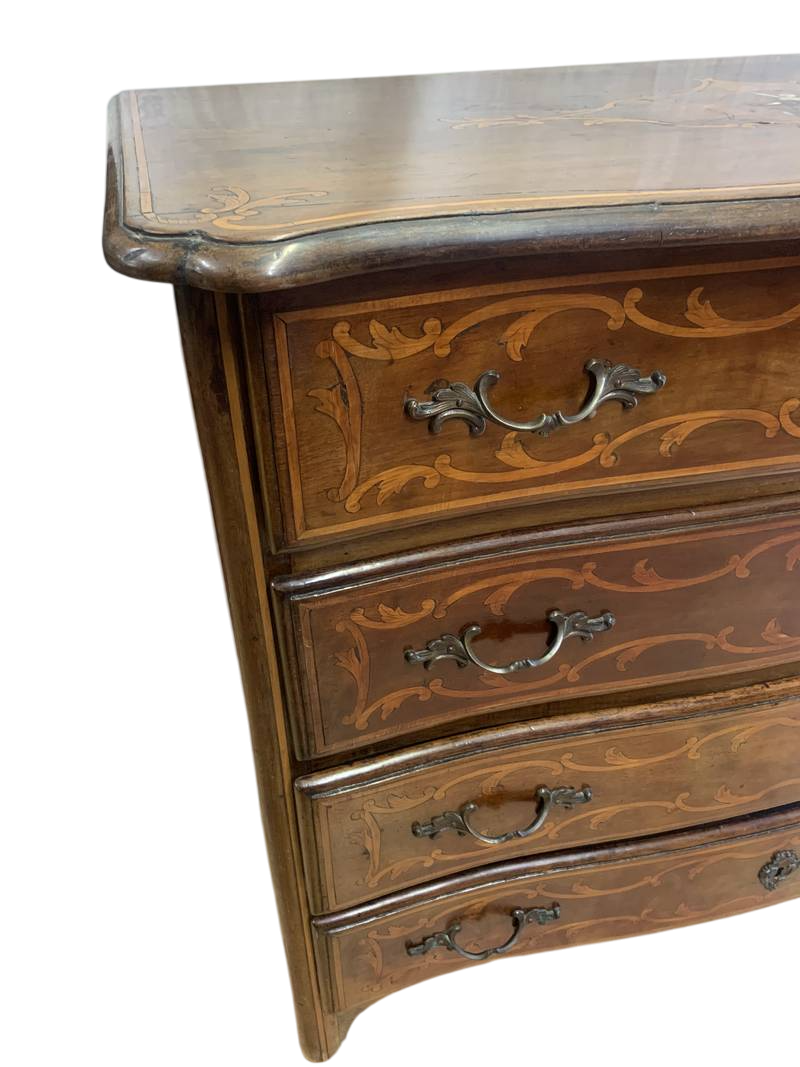 Antico cassettone piemontese in noce del XVIII secolo intarsiato