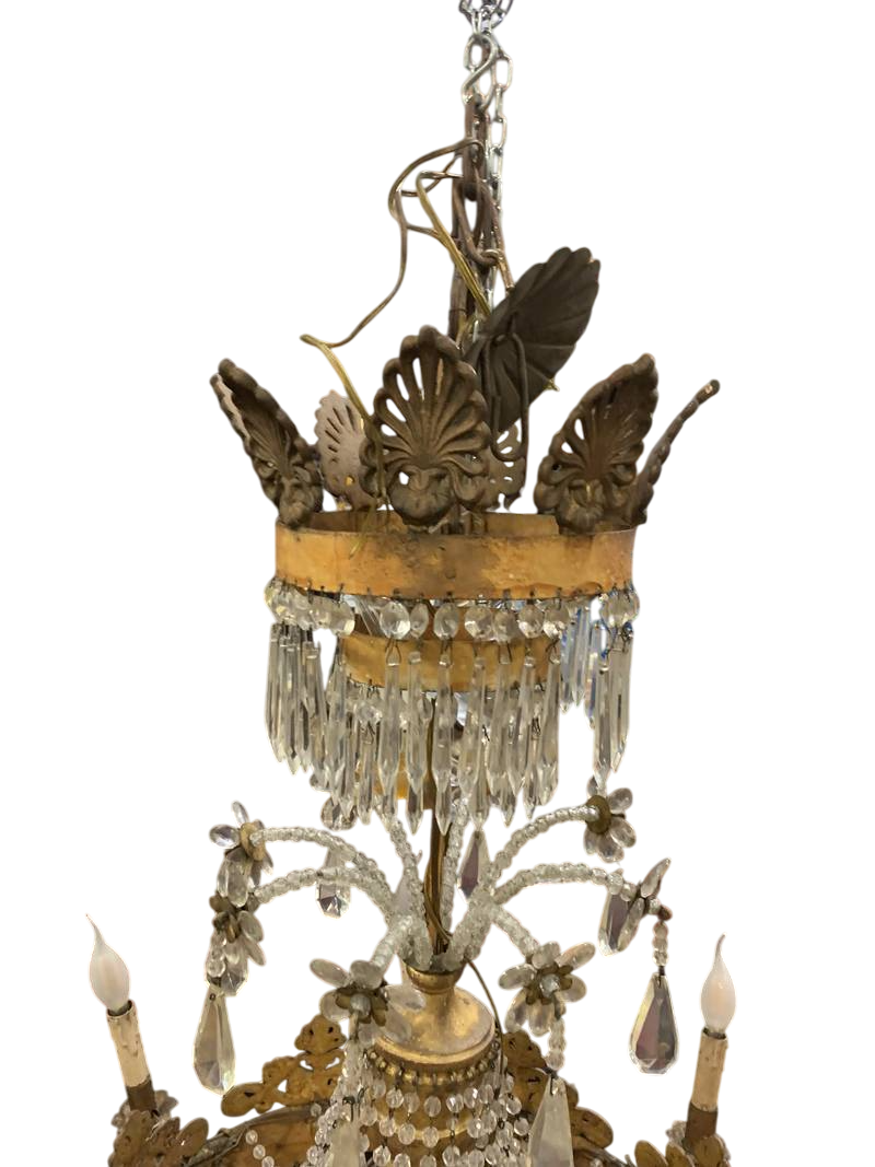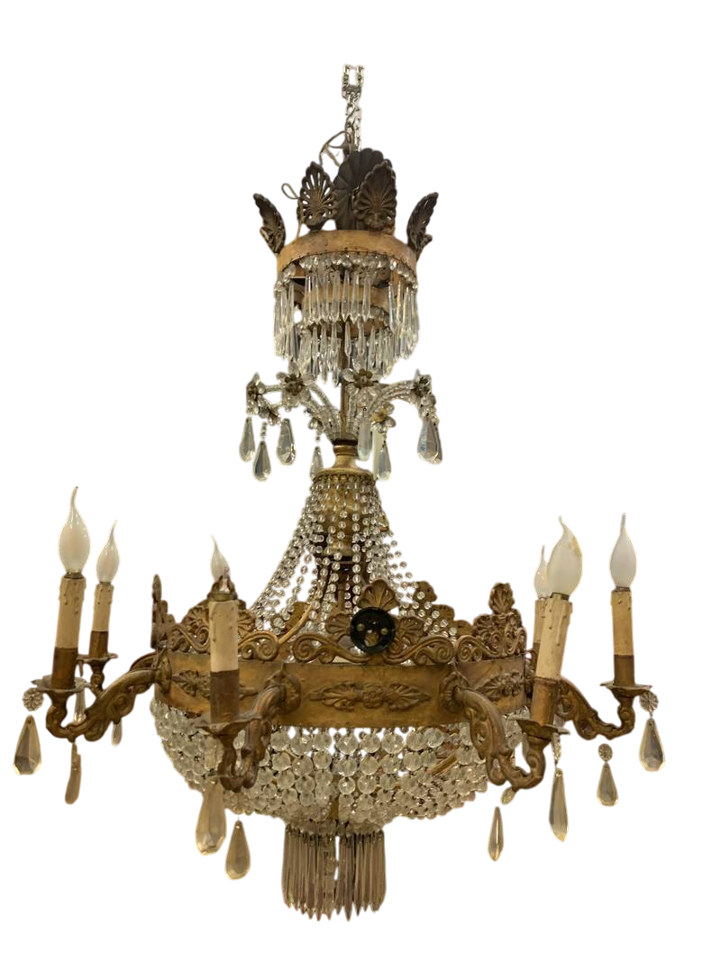 Antico grande lampadario a cascata a 8 fiamme cristallo e bronzo dorato tardo Impero