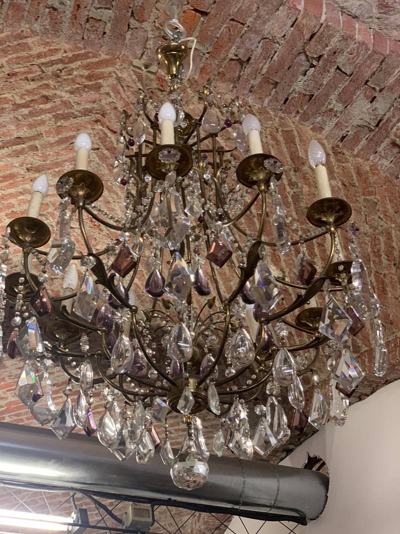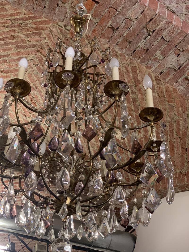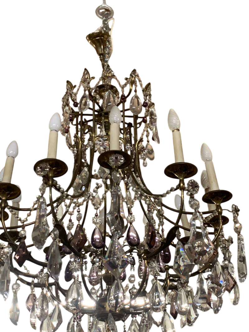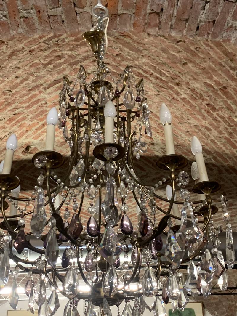Antico lampadario di cristallo a dodici luci con fusto in ferro arricchito da cristalli alcuni in color viola