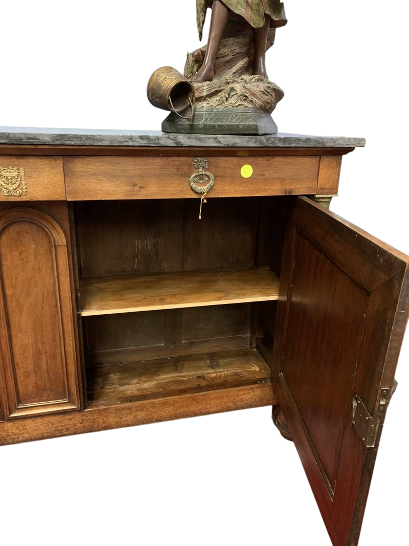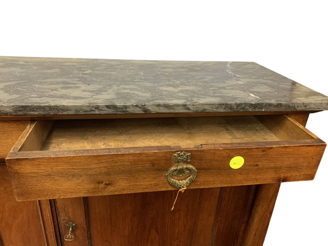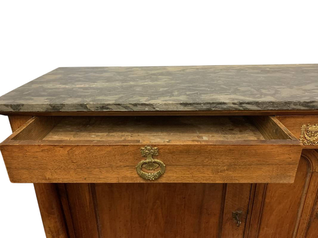 Presenta un piano in marmo bardiglio originale e colonne con bronzi cesellati e dorati. Vi sono 3 cassetti superiori e due ante inferiori.
