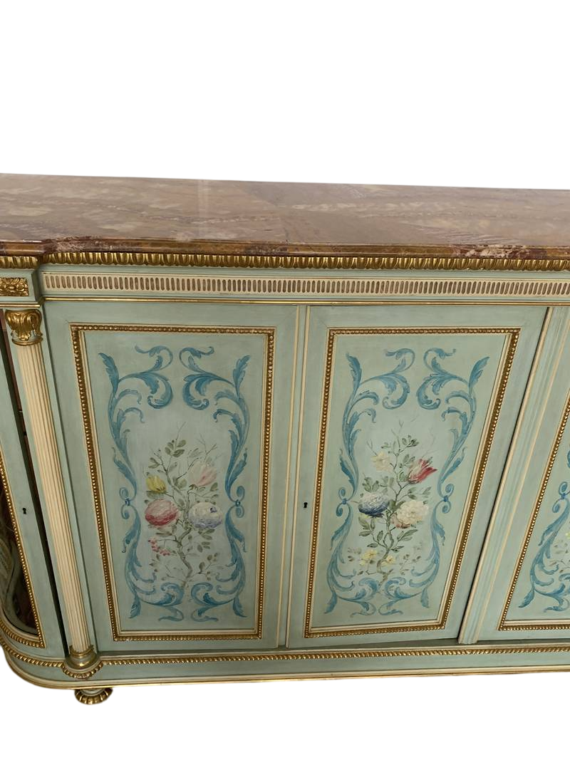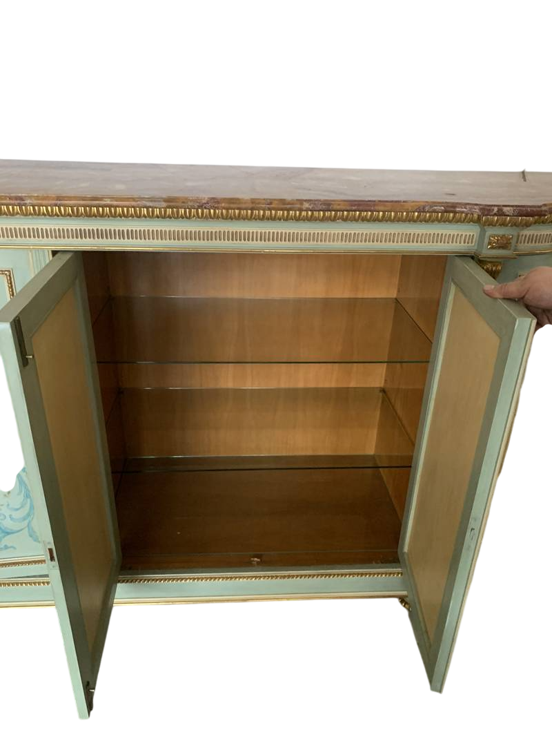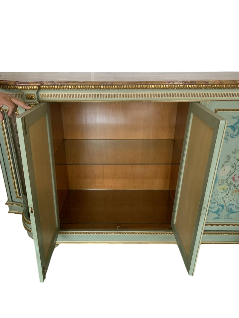 lacca verde pastello, crema e finiture dorate le quattro ante sul fronte dipinte con fiori, piano in marmo Broccatello