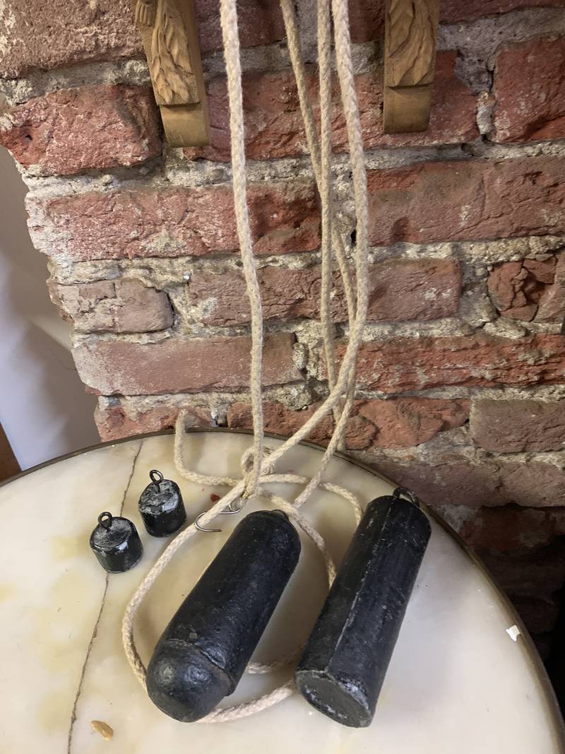 - Il movimento è azionato da pesi che pendono al di sotto, come si vedono le corde nell’immagine.