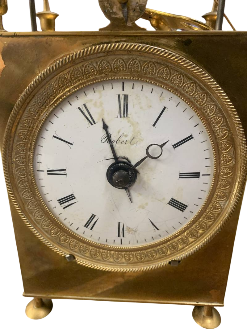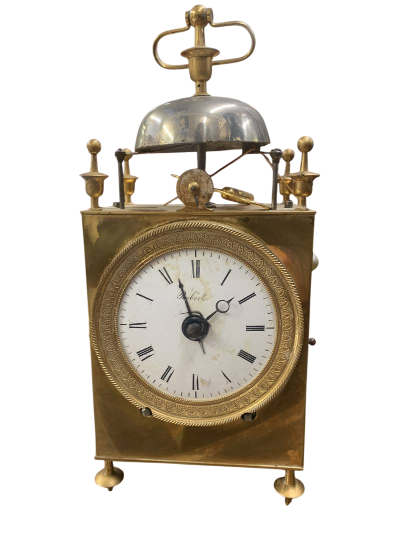 prezioso antico e raro OROLOGIO DA VIAGGIO (PRE-PENDULETTE D’OFFICIER o CAPPUCCINA) Il movimento è contenuto in una cassa aperta in ottone dorato, con montanti che terminano in pinnacoli torniti.