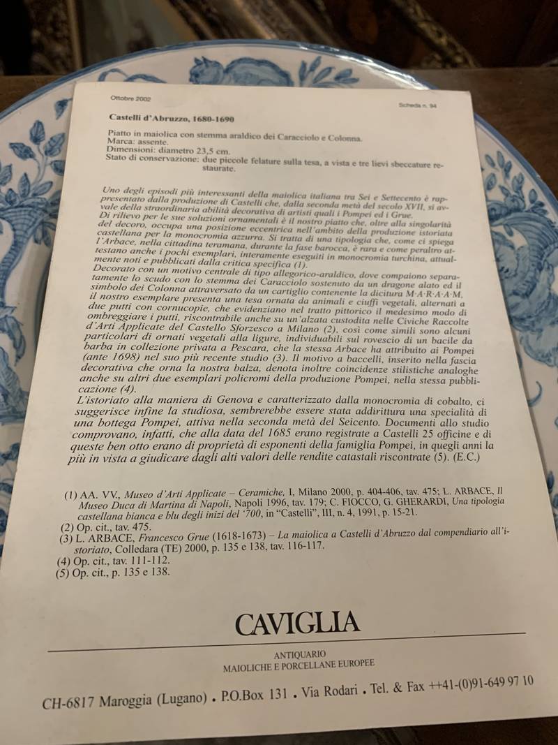 Antico piatto Castelli d’abruzzo con stemma araldico con drago alato