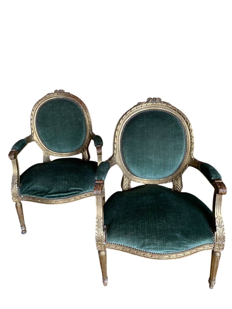 set di di due poltrone ,un divano e due poltroncine Stile Luigi XVI in legno intagliato e dorato