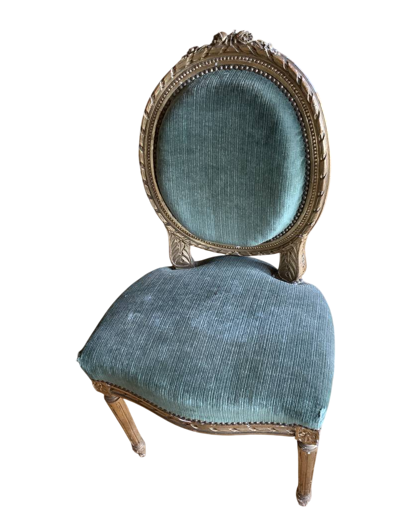 legno intagliato e dorato, con schienali ovali a medaglione e gambe diritte e scanalate